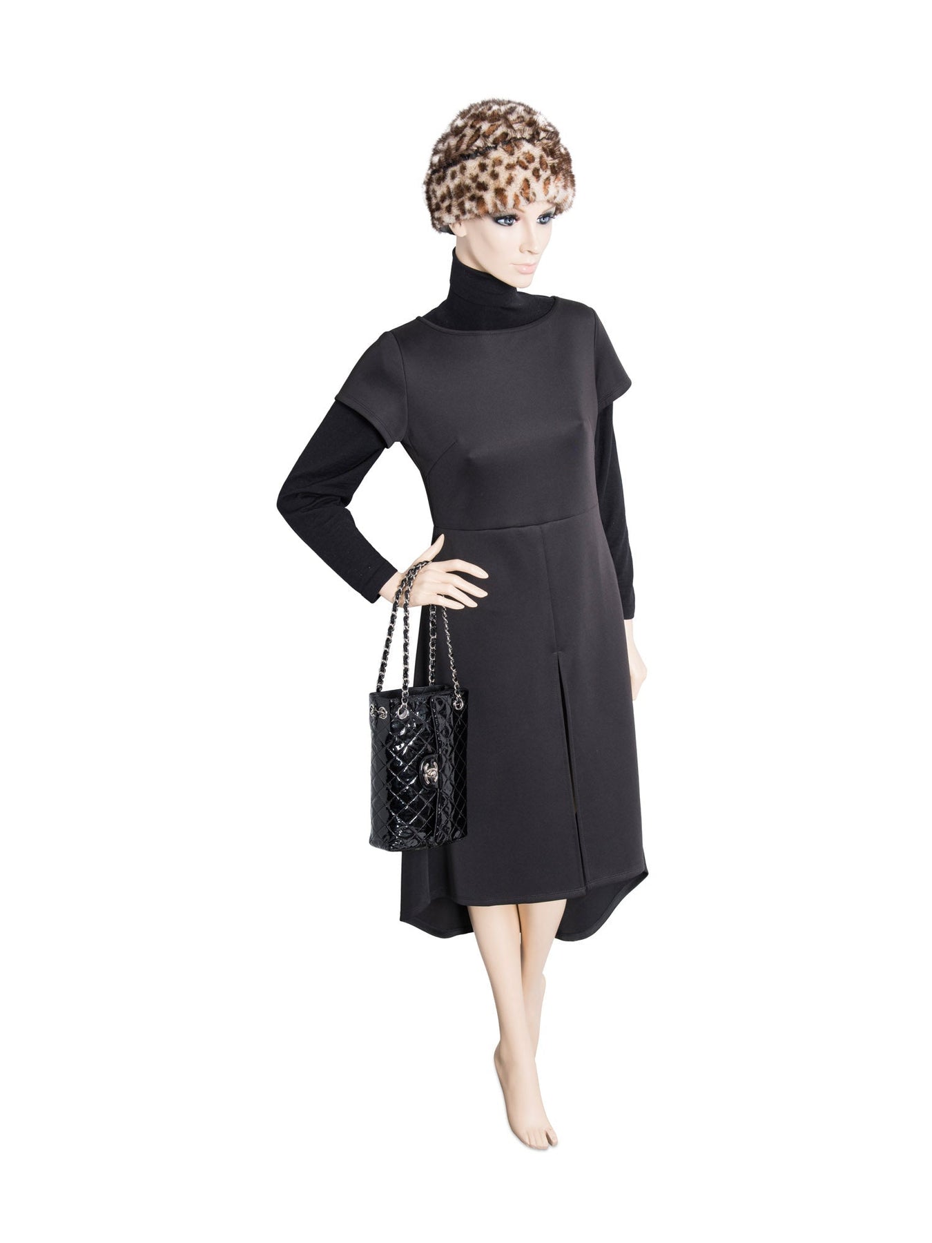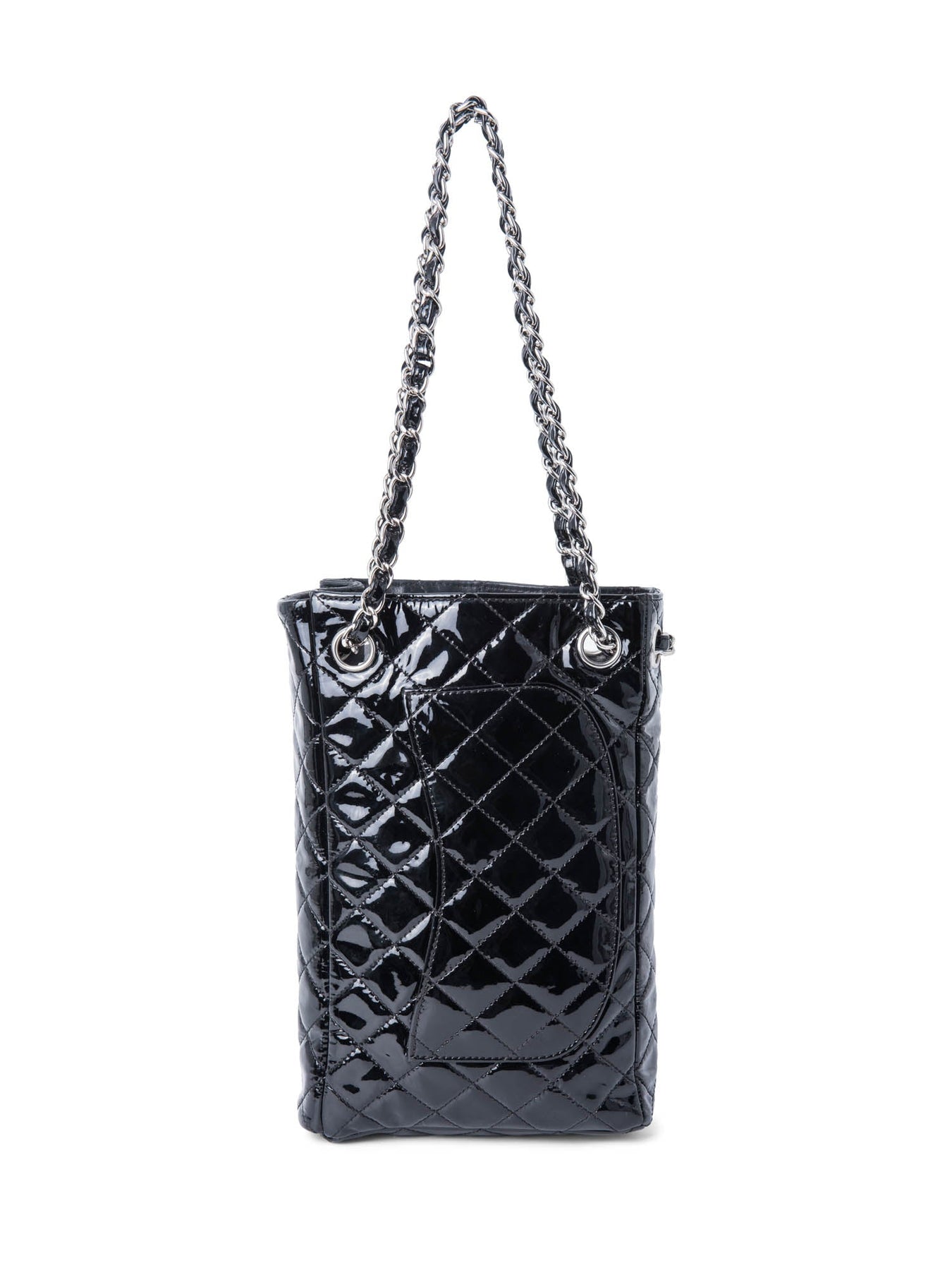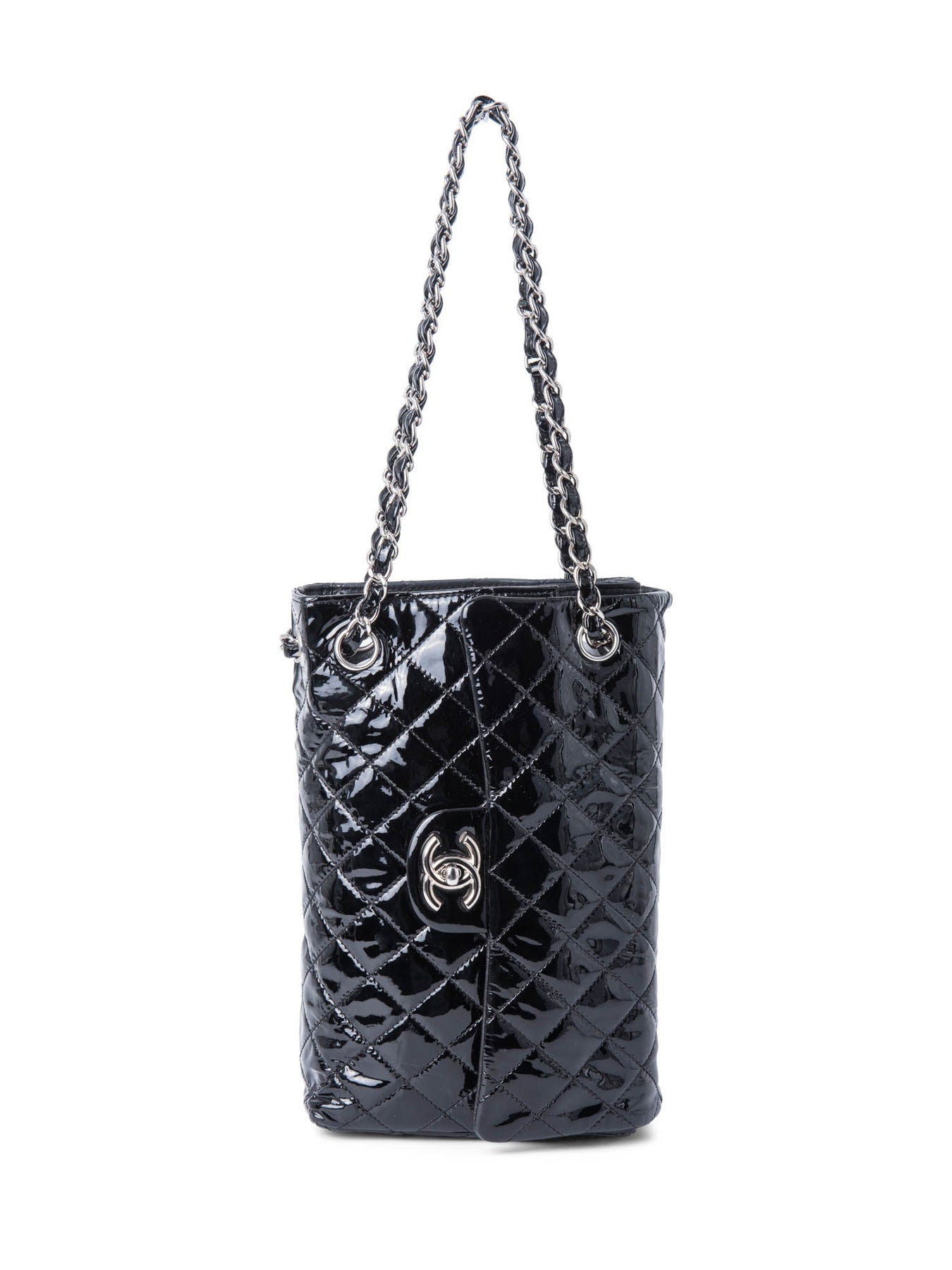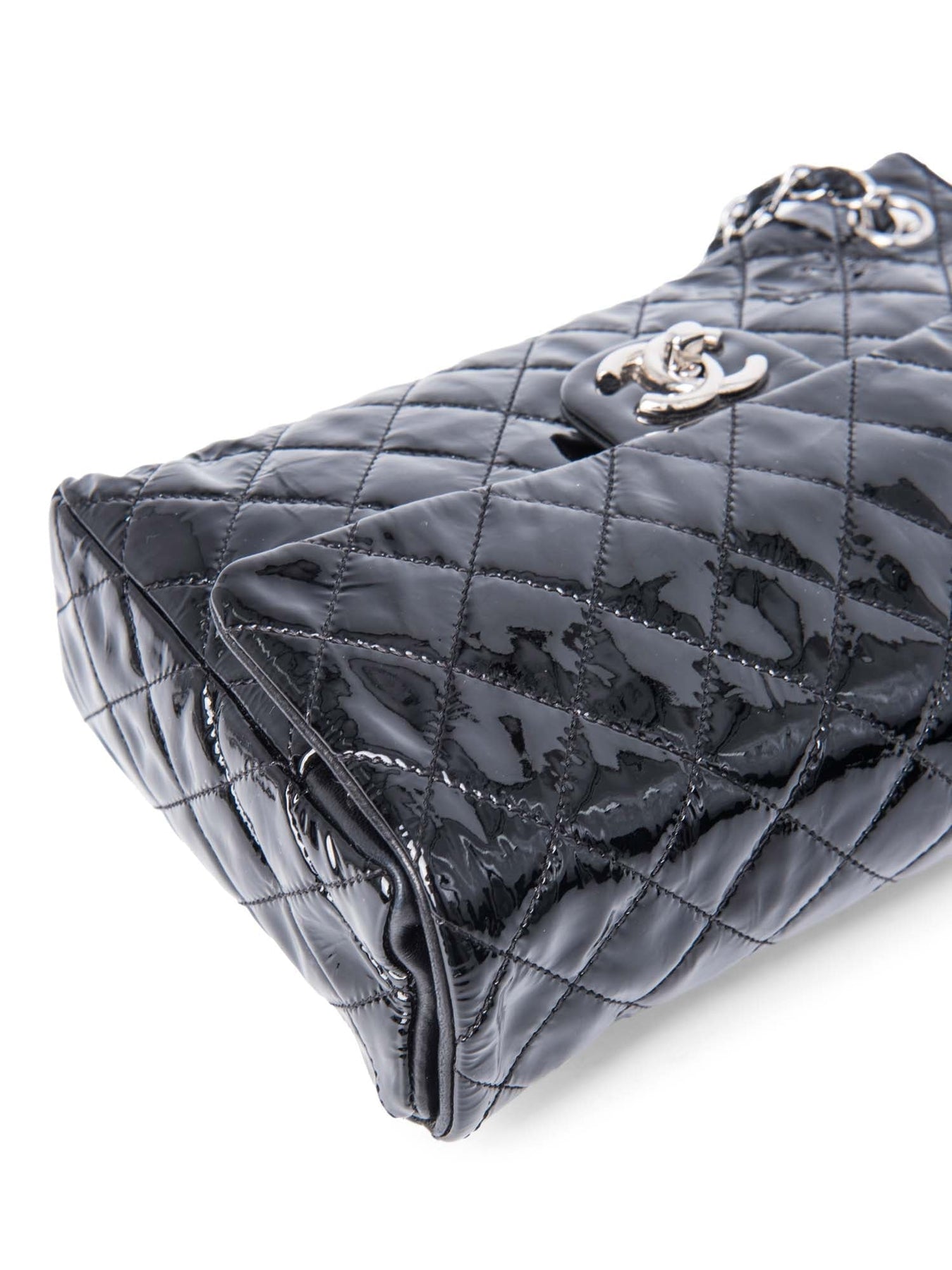CHANEL 2.55 Flap Bag or . This CHANEL bag is in all black patent leather with silver tone hardware.  It features a large CC logo on the front flap, chain detailing, rear pocket, and a patent leather chain. The front flap opens with a turn-lock closure to reveal a zipper pocket. The top opening reveals a black leather lined interior with a patch pocket.