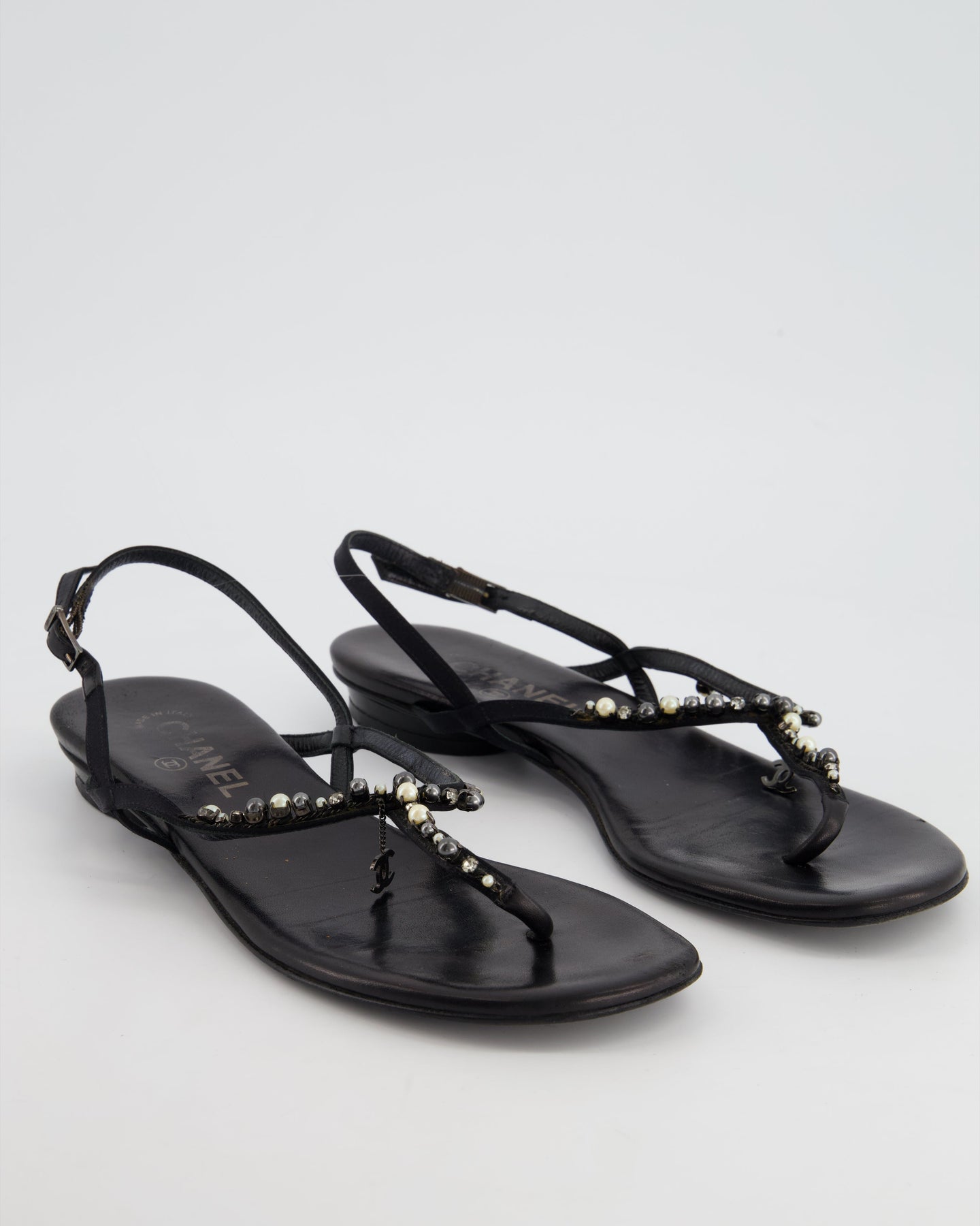 Top Quality Chanel Black Embellished Leather Ankle Strap Sandals with CC Charm Detail Size EU 41