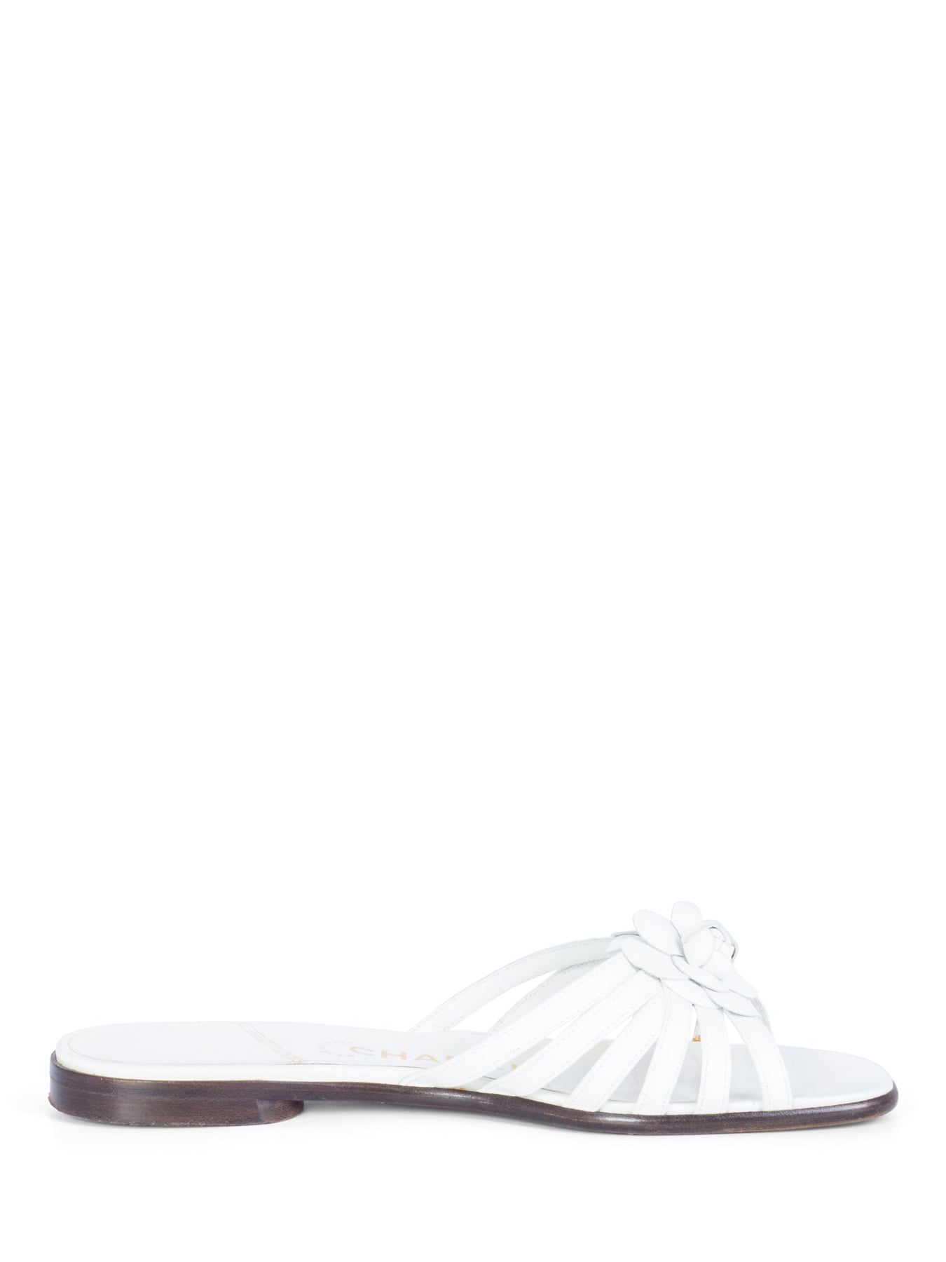 CHANEL Camellia Leather Slip On Sandals or . These CHANEL sandals are crafted in white leather with camellia flower accent on the front. They feature leather straps and easy slip on design.