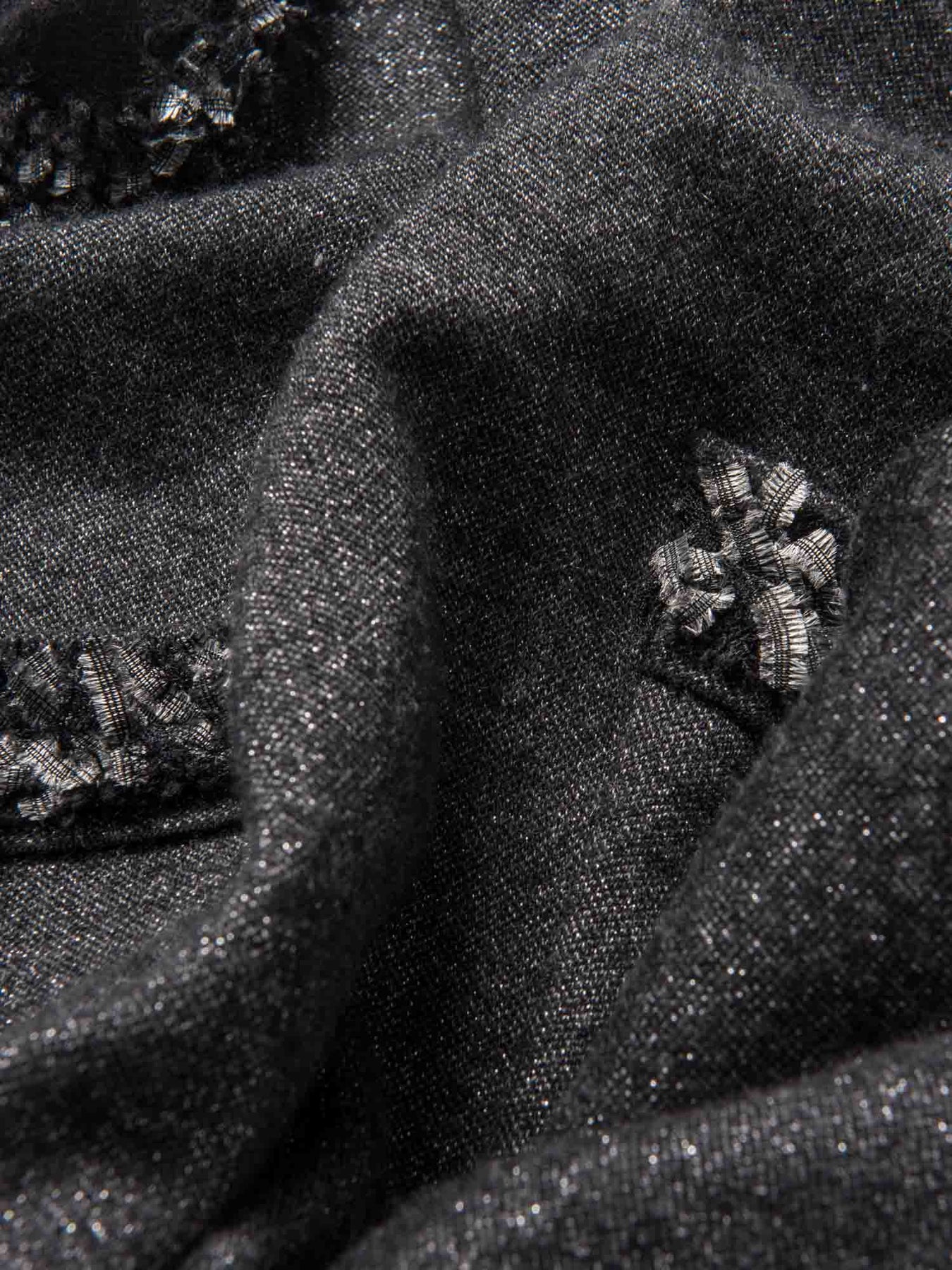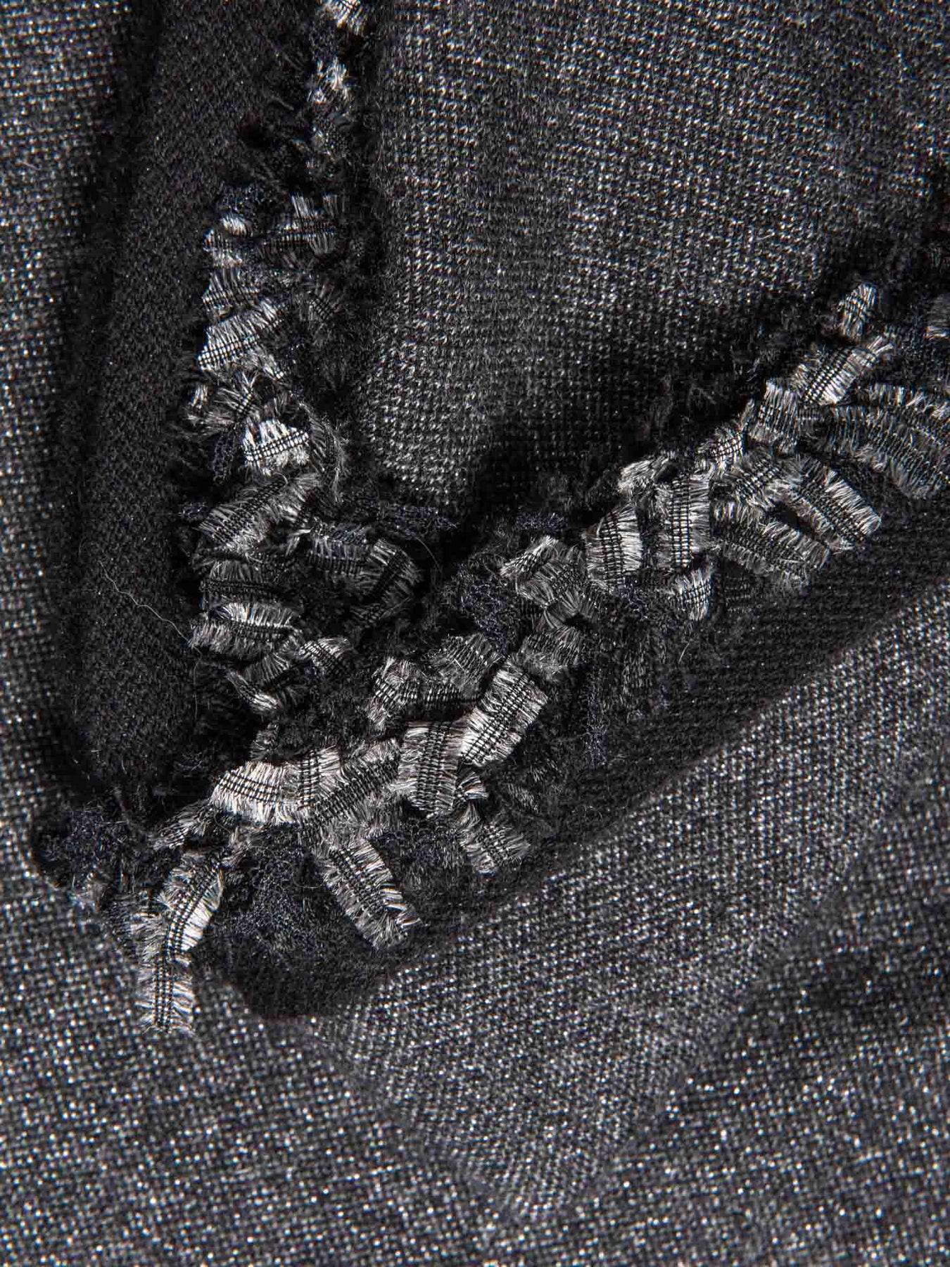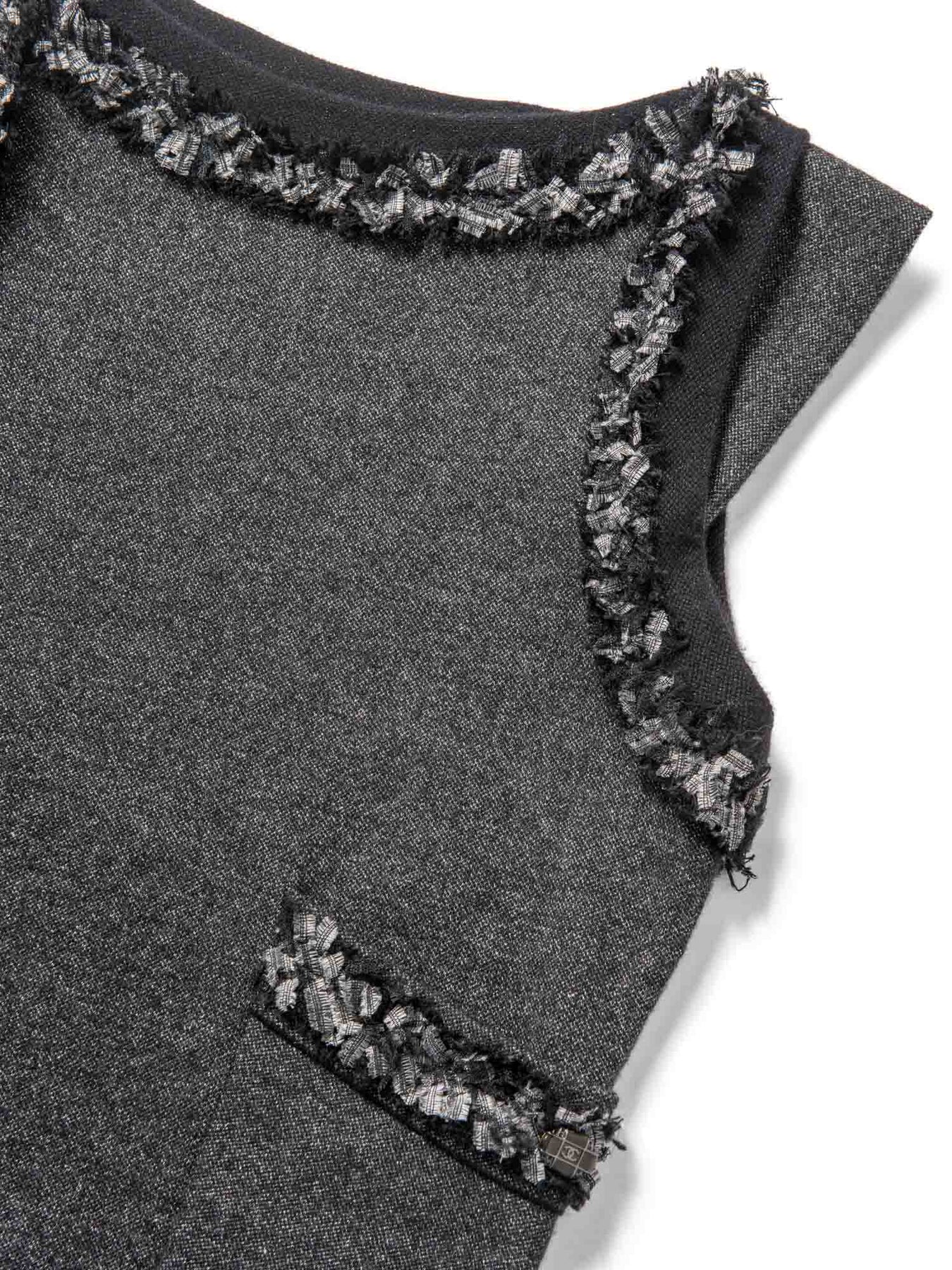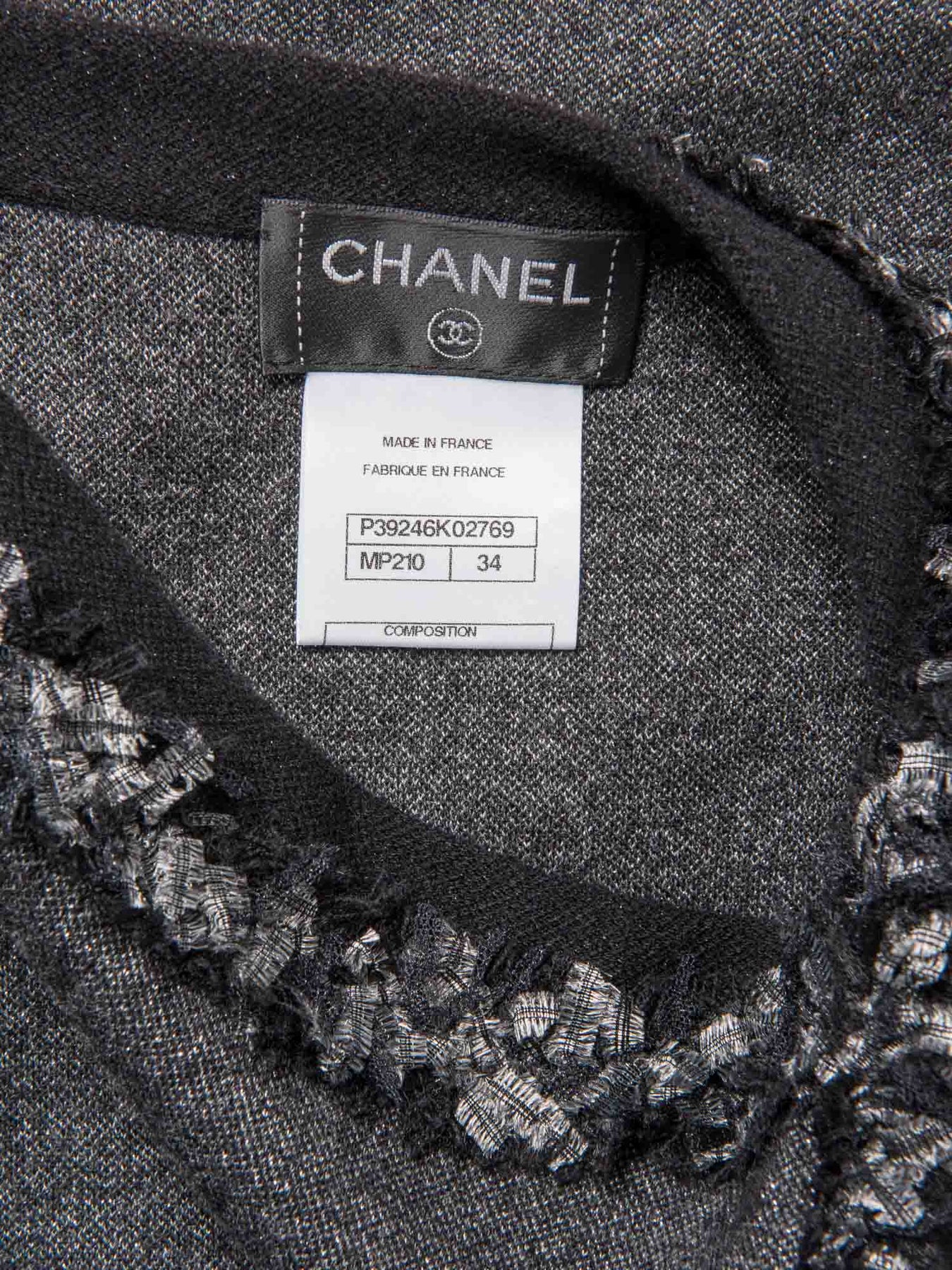 CHANEL Cashmere Dress or . This CHANEL dress is in a heather grey cashmere/silk fabric blend with shiny fringe embellishments along the collar and sleeve openings. It features two front pockets and the fabric is lined woven with sparkling material for a stunning look.