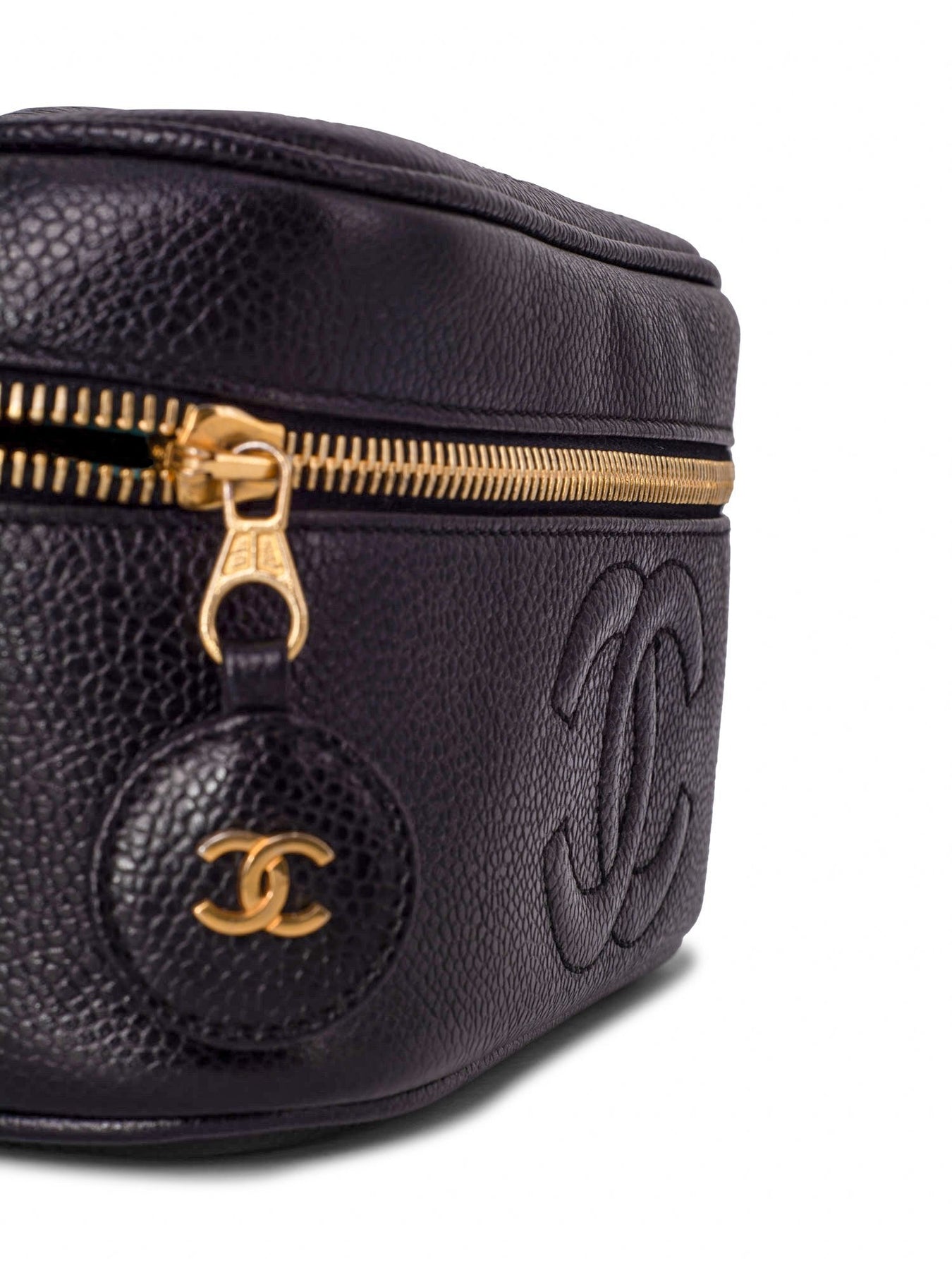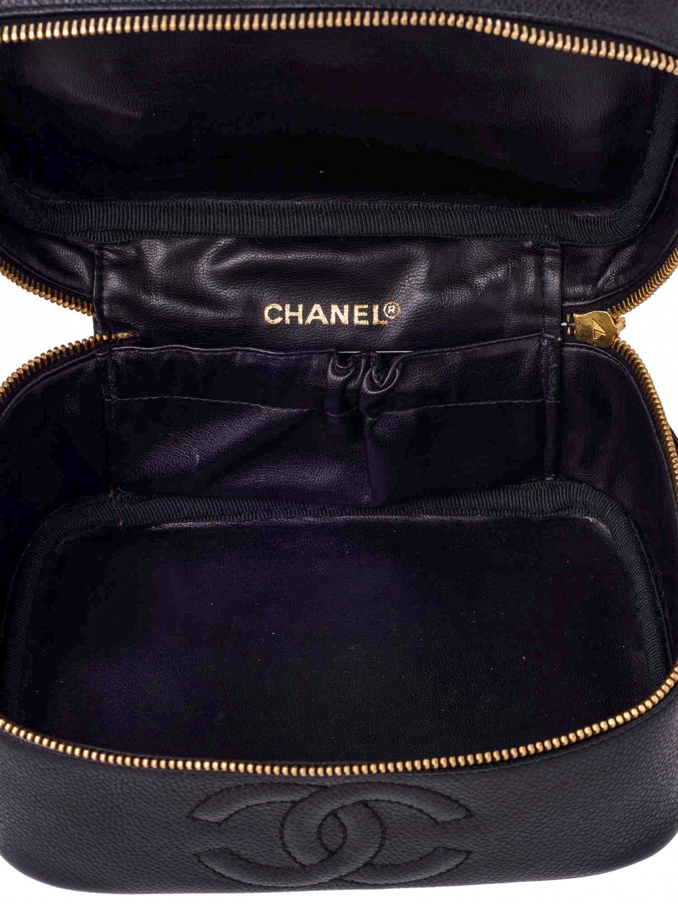 Chanel Vanity Bag or . This Chanel bag is in black caviar leather, featuring a 24K gold plated hardware, CC logo on the front, top zipper closure which opens to a spacious interior lined in black leather. This Chanel vanity bag is highly collectible.