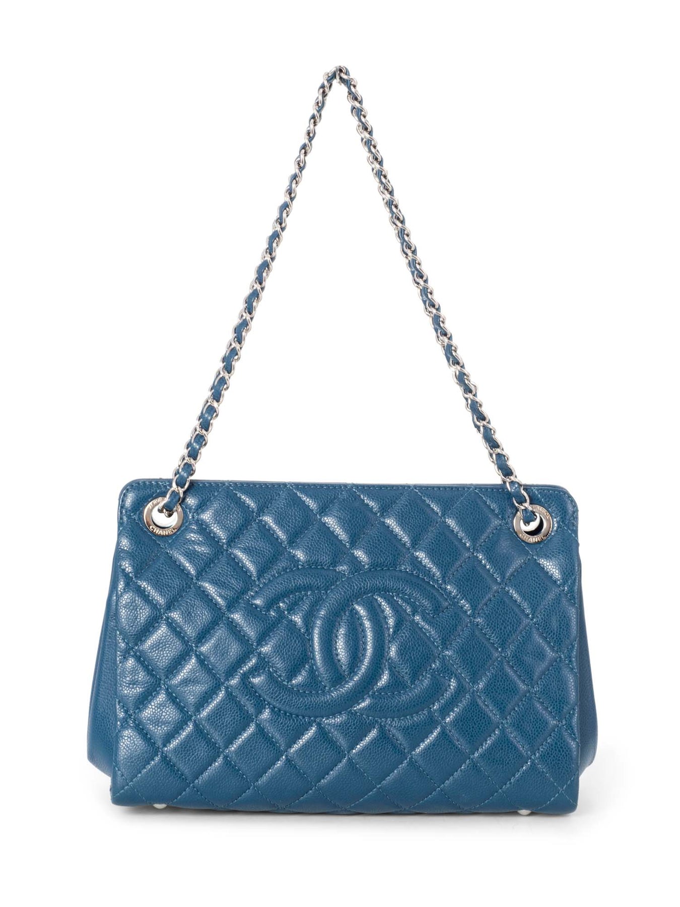 CHANEL Caviar Quilted Grand Shopper Bag or . This stylish Chanel bag is crafted in blue quilted leather with silver-toned hardware. The bag features leather threaded polished silver shoulder chains, diamond quilting, and quilted CC logo. The interior opens to a cream cotton lining with one zippered pocket. This is a perfect everyday tote from Chanel!