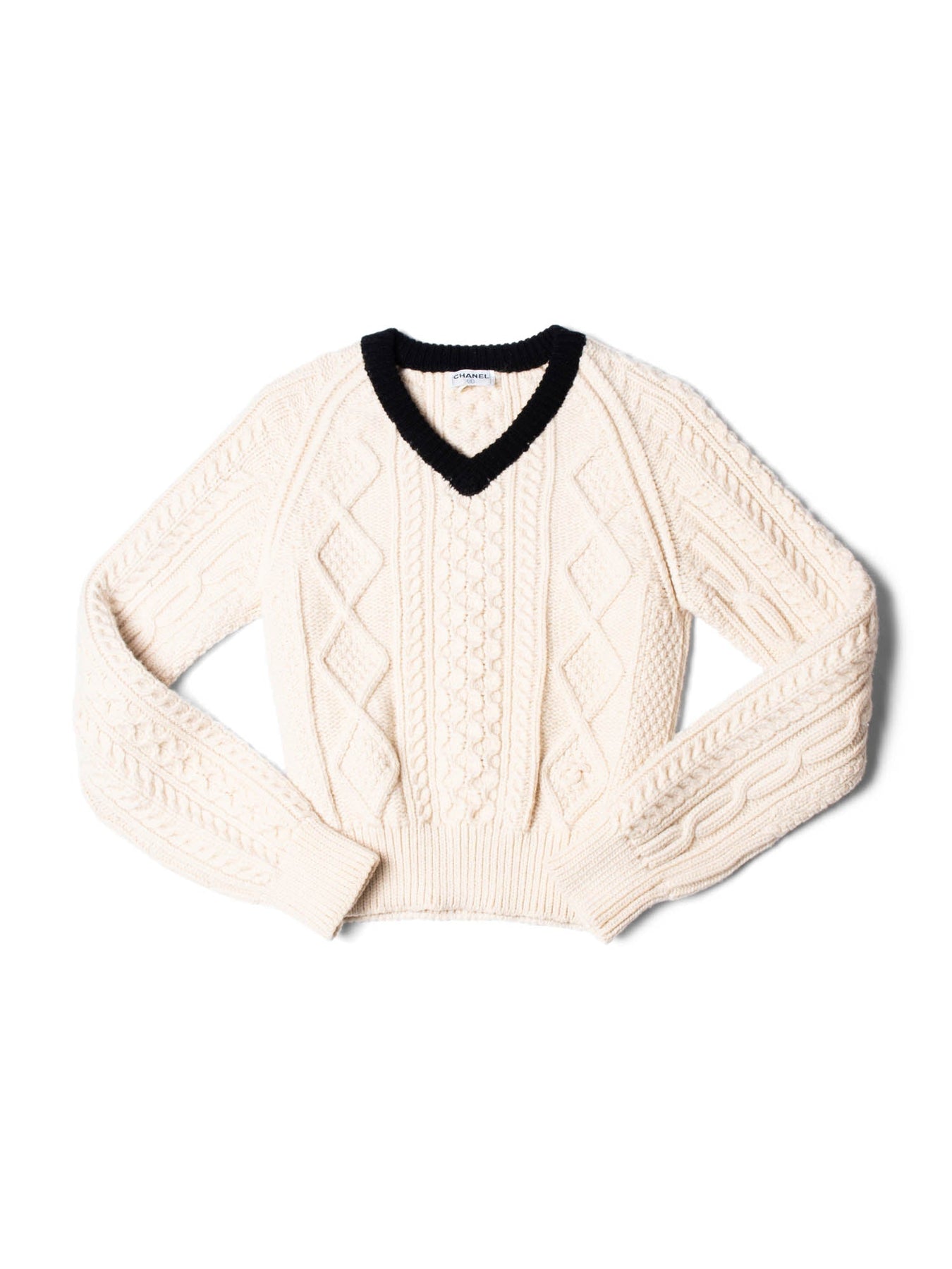 CHANEL Knit Sweater or . This CHANEL top is in a beautiful ivory cable knit fabric with a CC logo stitched on the front. This sweater also has black accent knitting along the V-neck and features a cropped fit.