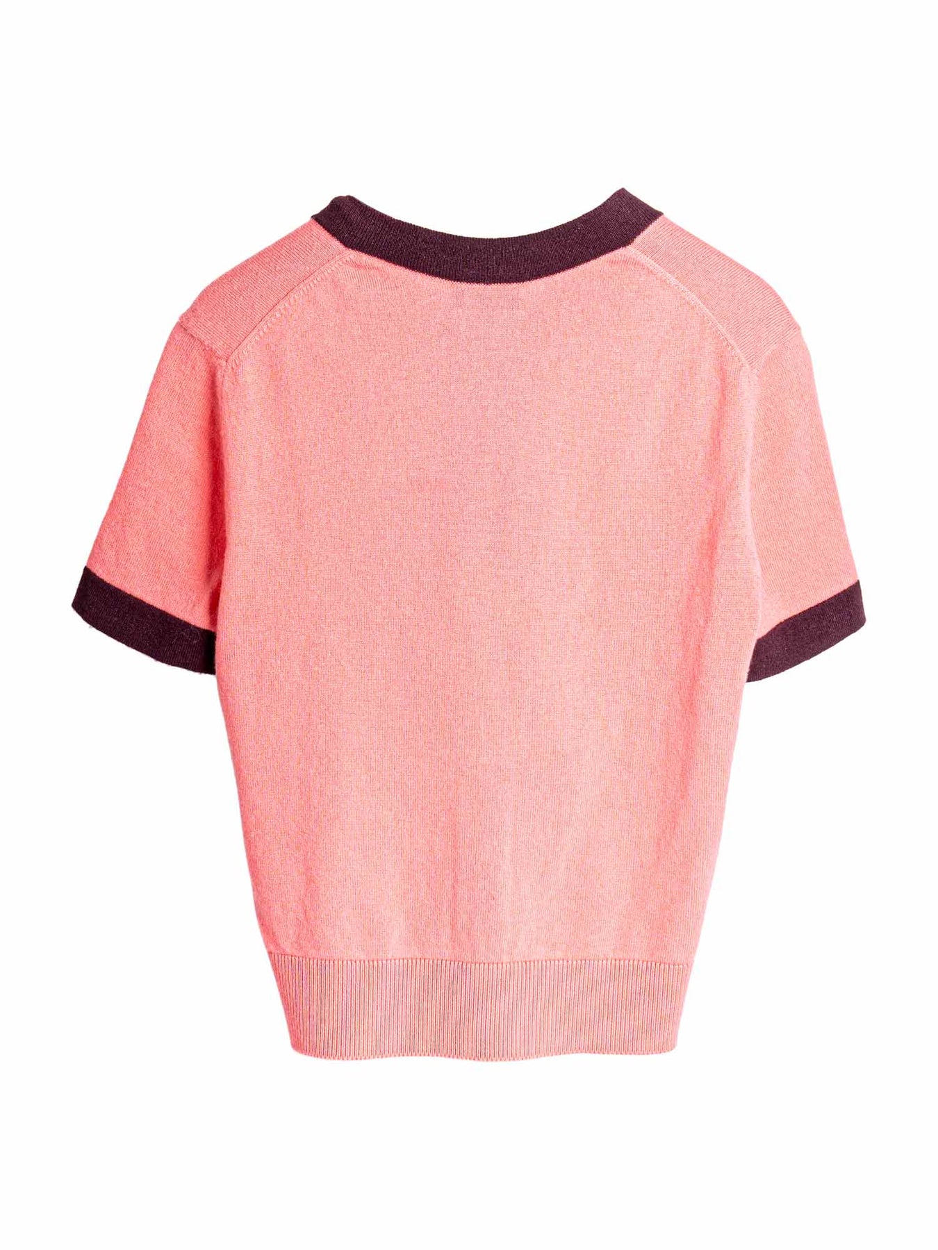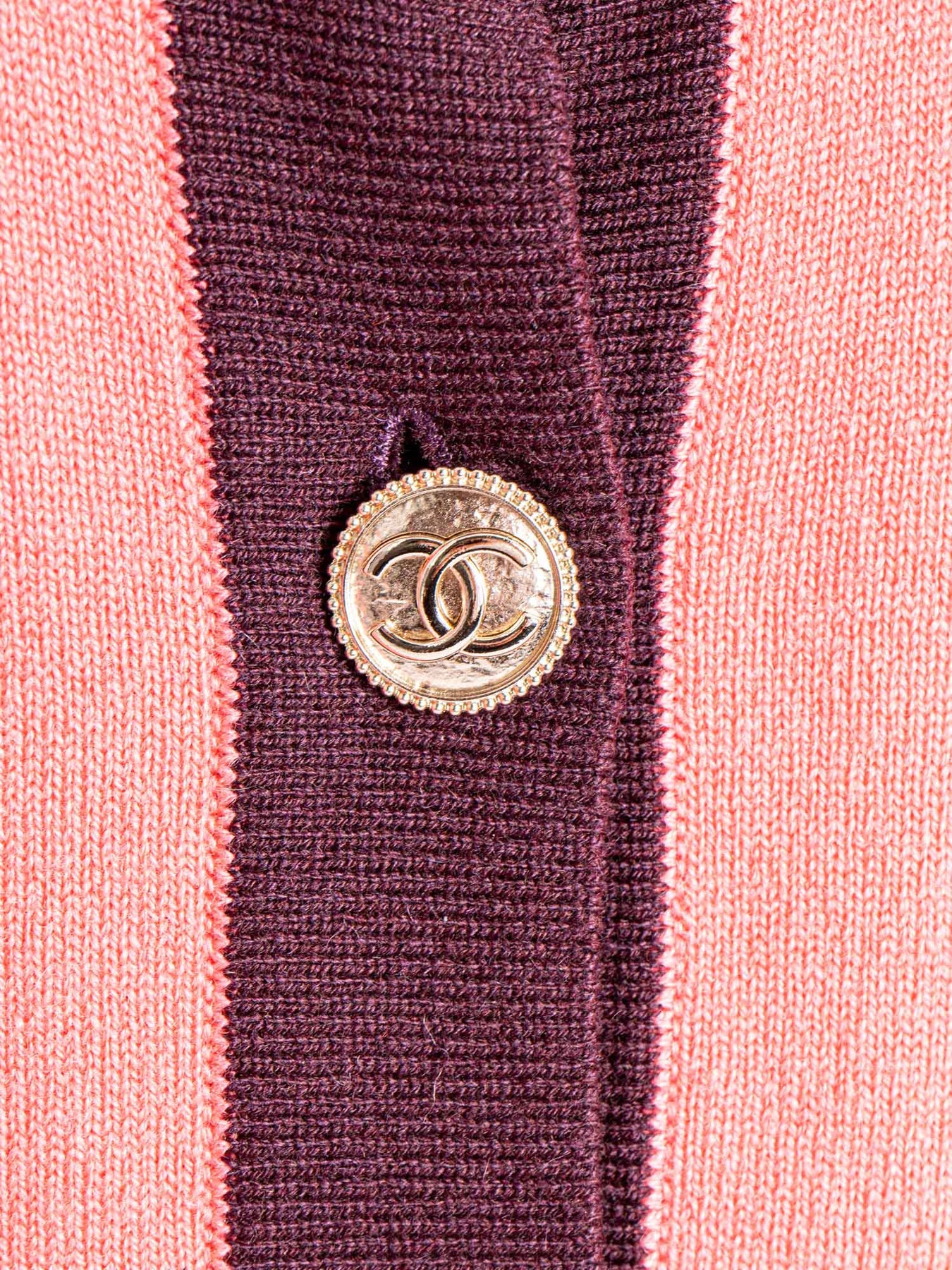 Chanel Cashmere Cardigan or . It is in pink cashmere fabric with a dark purple outline. It features gold CC logo buttons and short sleeves.