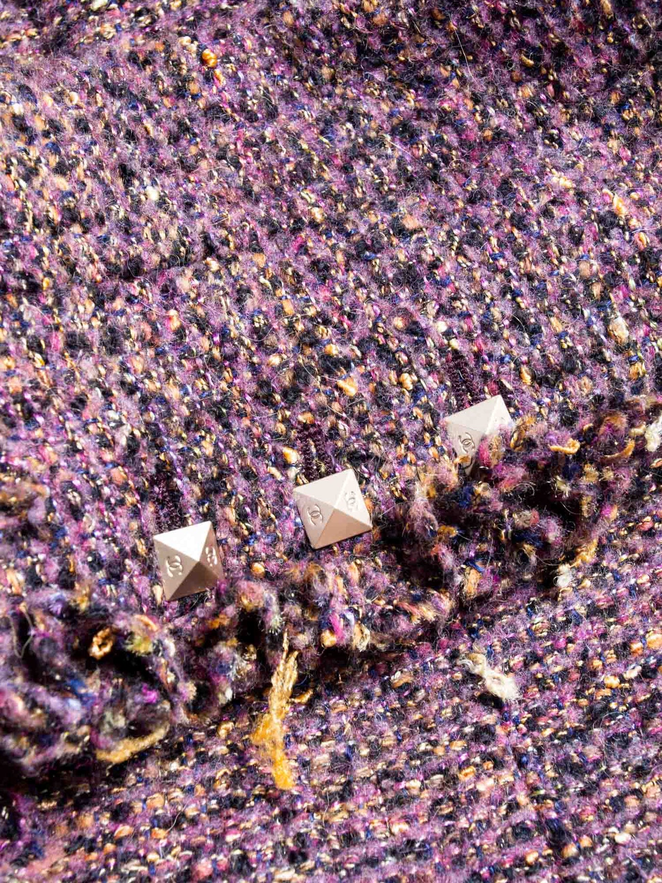 Chanel Tweed Jacket or . This jacket is in purple, yellow, black, and blue lesage tweed with fringe throughout. It features gold CC logo buttons on the sleeves and CC Logo and Camellia purple silk lining.