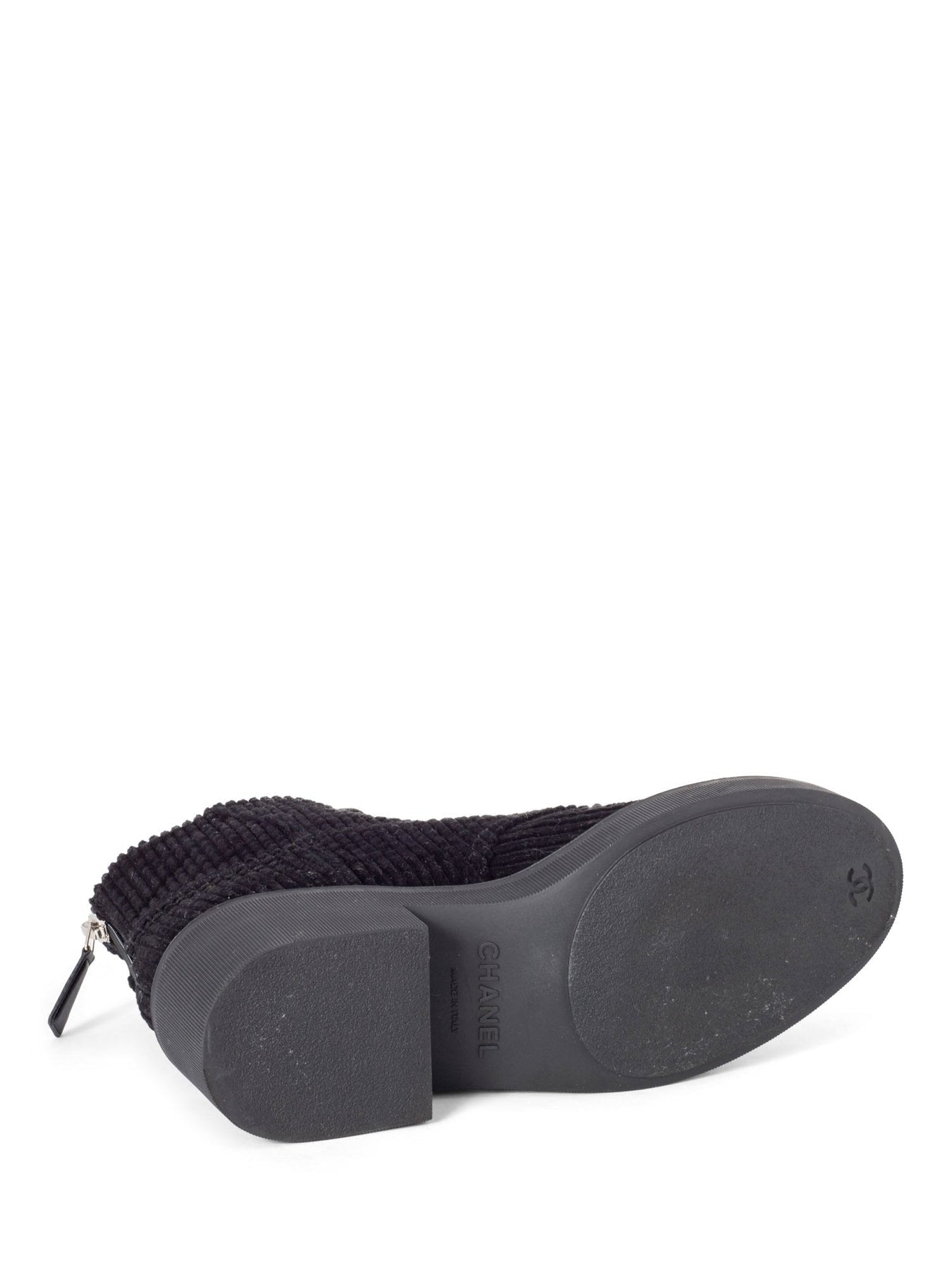 Chanel Lace Up Corduroy short boots or . These elegant Chanel boots are in black corduroy detailed with pink pearls. The boots feature a 2'' block heel, a zipper for closure with CC logo, CC logo on each toe and silver tone hardware.