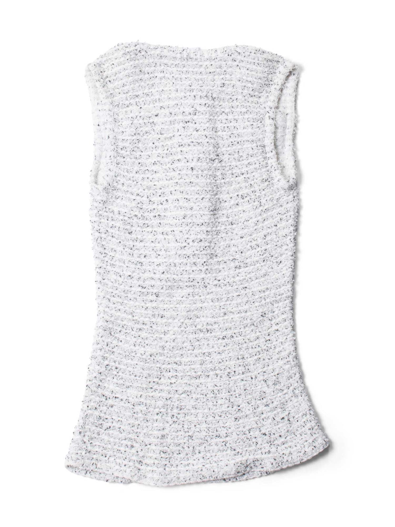 CHANEL Tweed Blouse or . This sleeveless top is crafted in white tweed fabric blend interwoven with hits of black. It features pearl "CC" logo buttons and two front chest pockets.