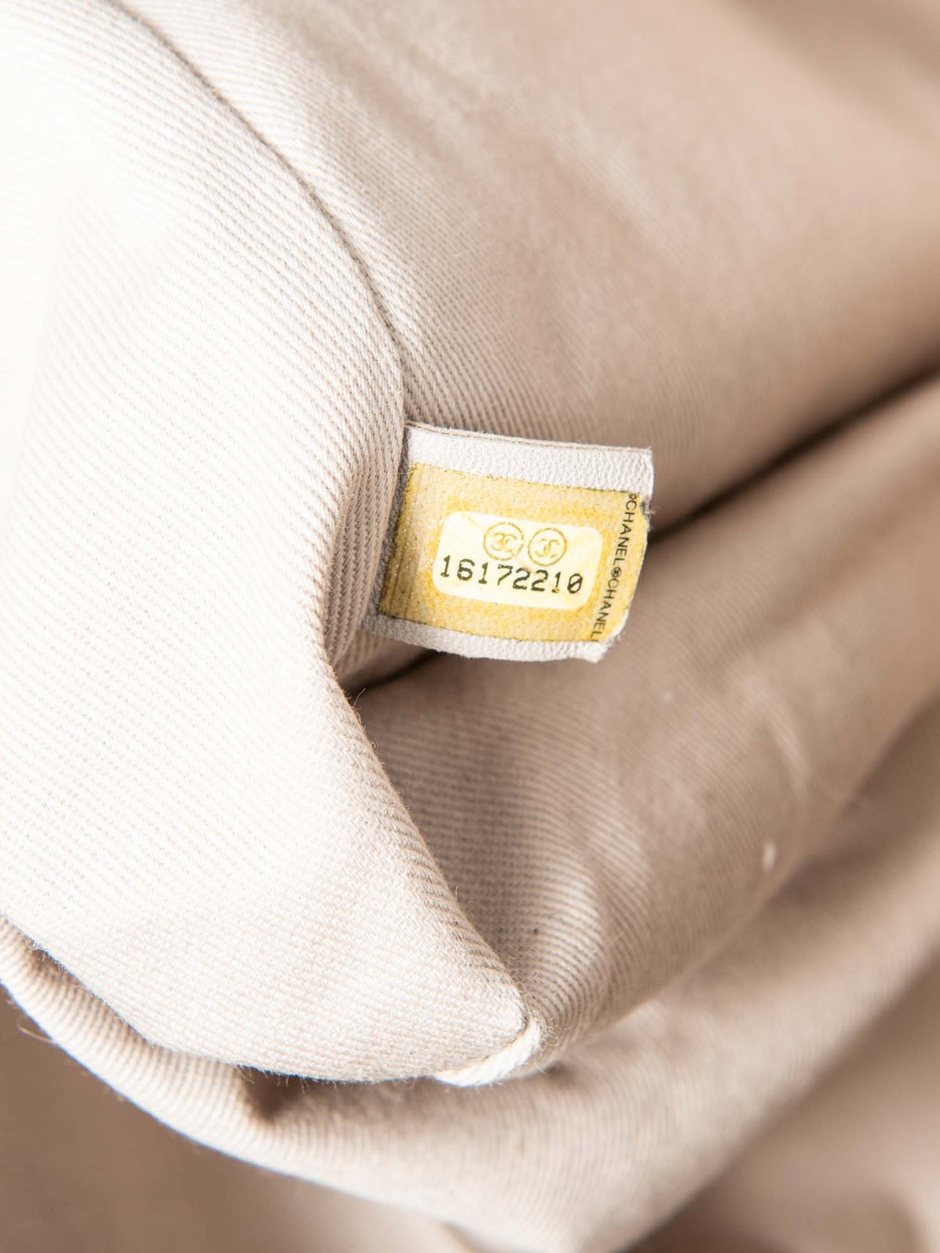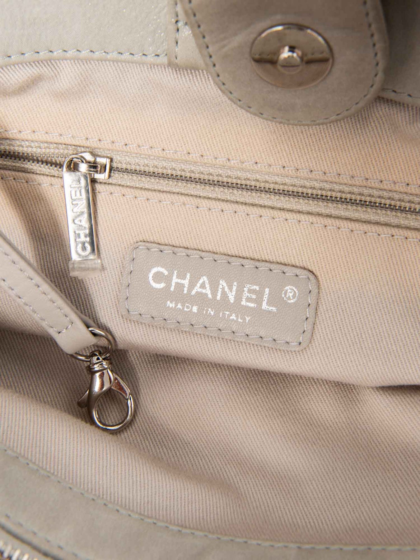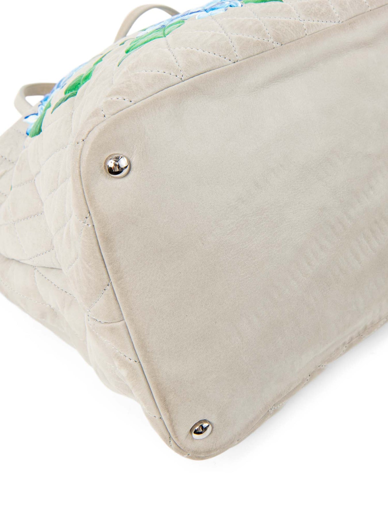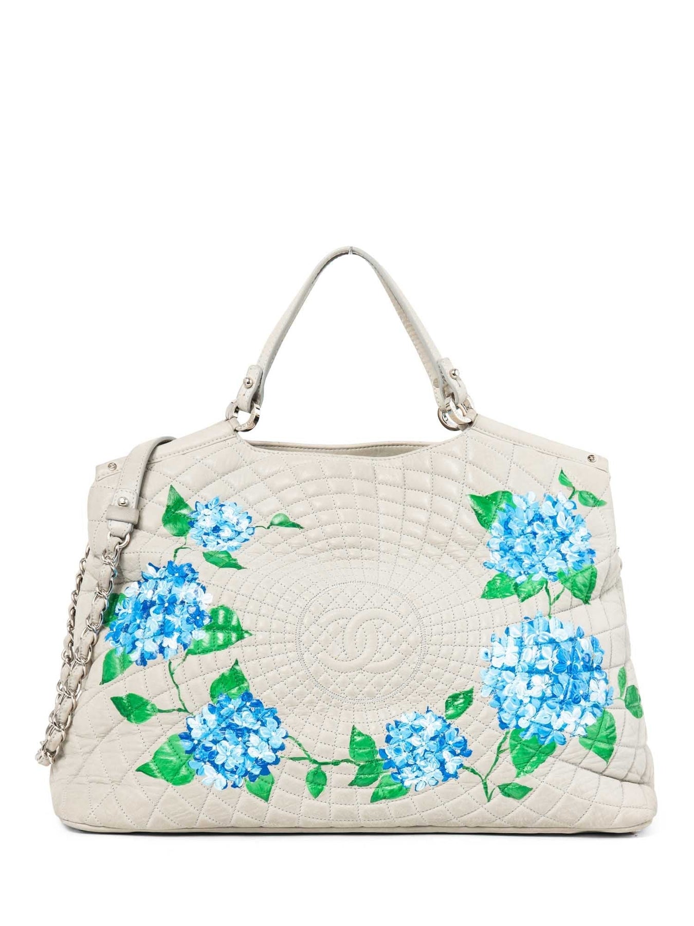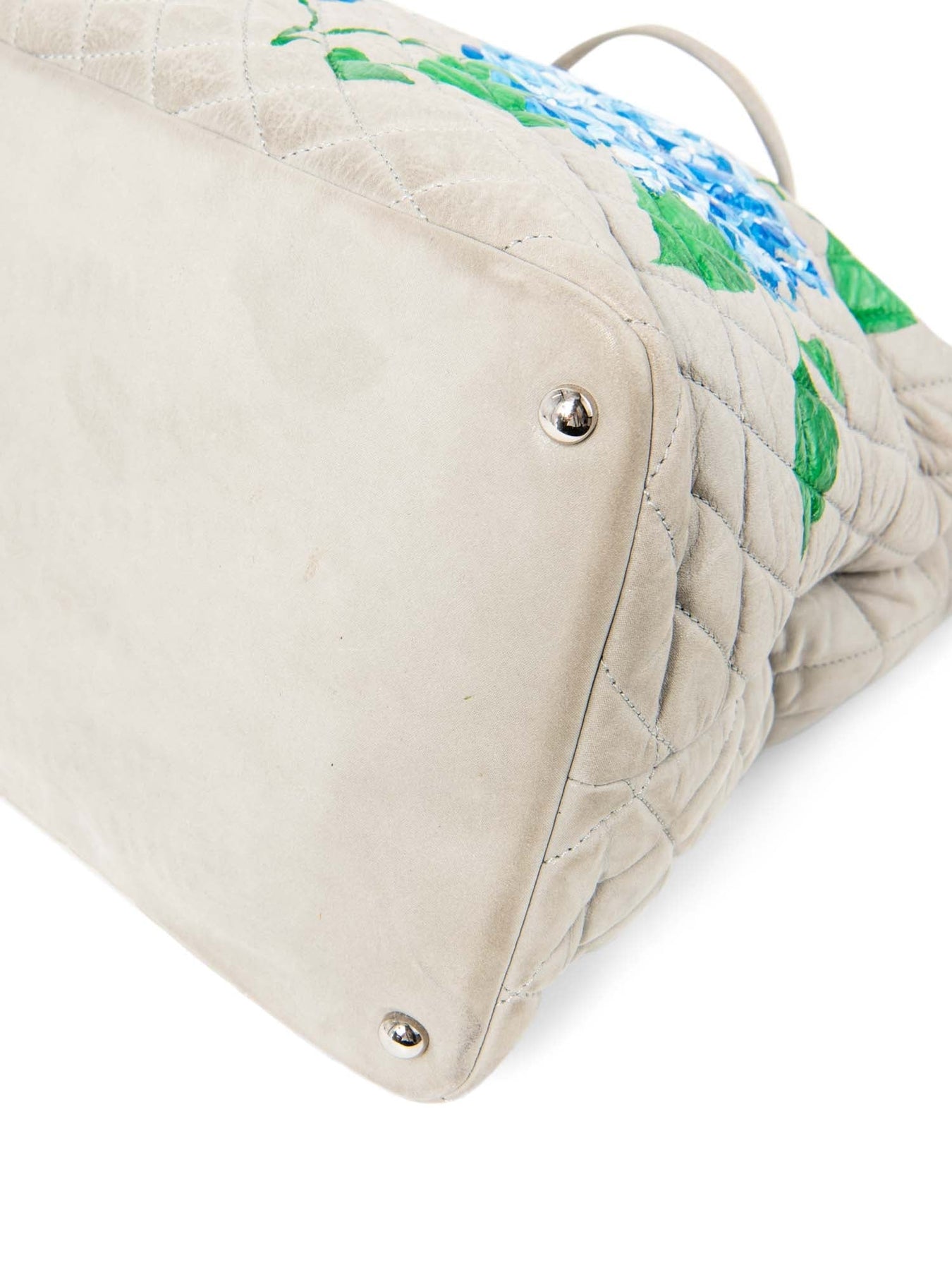 CHANEL CC Logo Tote or . This CHANEL bag is in grey quilted suede textured glazed canvas, featuring silver-tone hardware, rolled top handles, silver shoulder chain, two inner compartments divided by zipped pocket, and grey canvas interior with side zipped pocket. This bag features a one of a kind hand-painted hydrangea ornament.