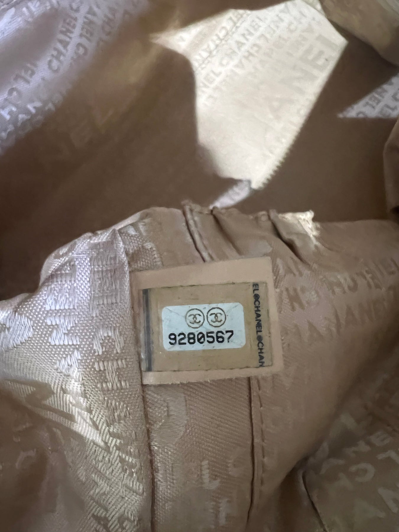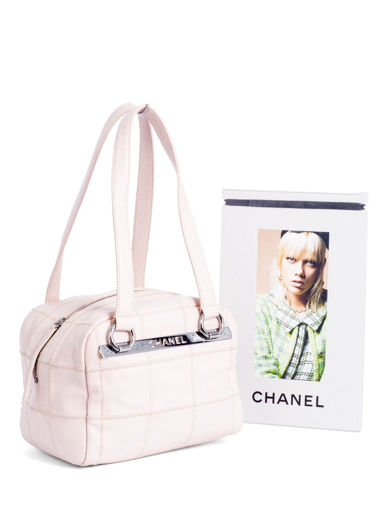 Chanel leather shoulder bag or . It is in light pink soft leather with silver-tone hardware. It features dual leather handles with one zipped interior pocket, tan Chanel logo lining, and a zipper closure.