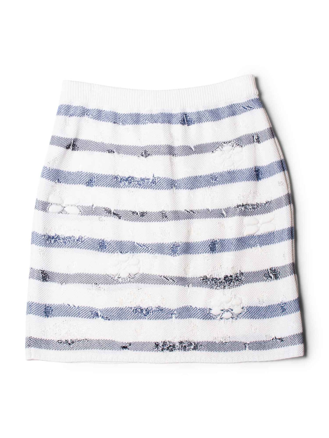 Top Quality Chanel CC Logo Striped Knit Distressed Camellia Skirt White Navy Blue