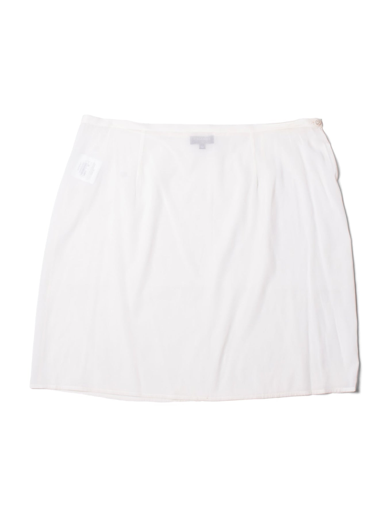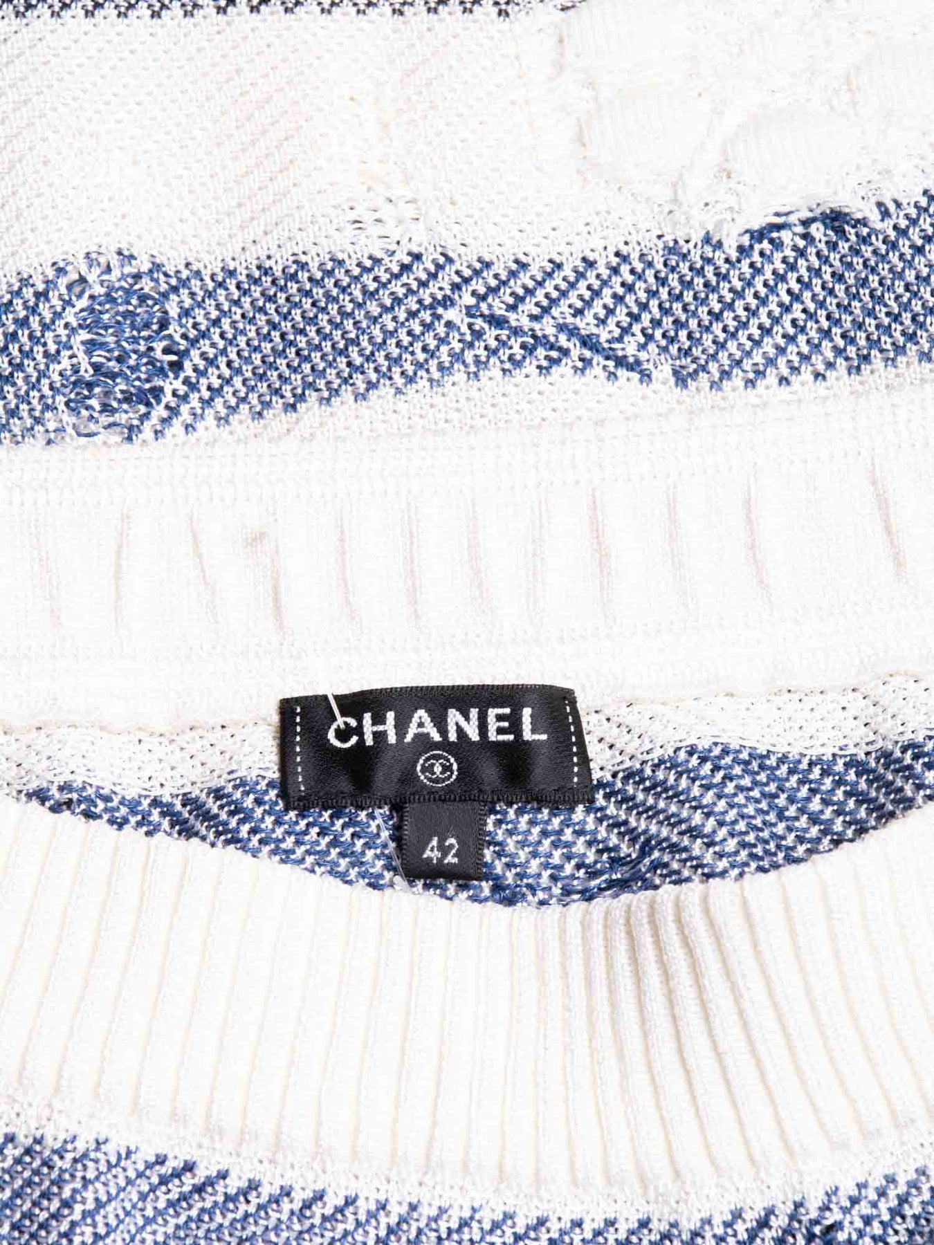 CHANEL skirt or . This CHANEL skirt is in white and navy knit stripe pattern, featuring camellia flowers, distressed detail throughout and pearl CC Logo accent near the waistband. This beautiful skirt also comes with a slip with CHANEL button closure.