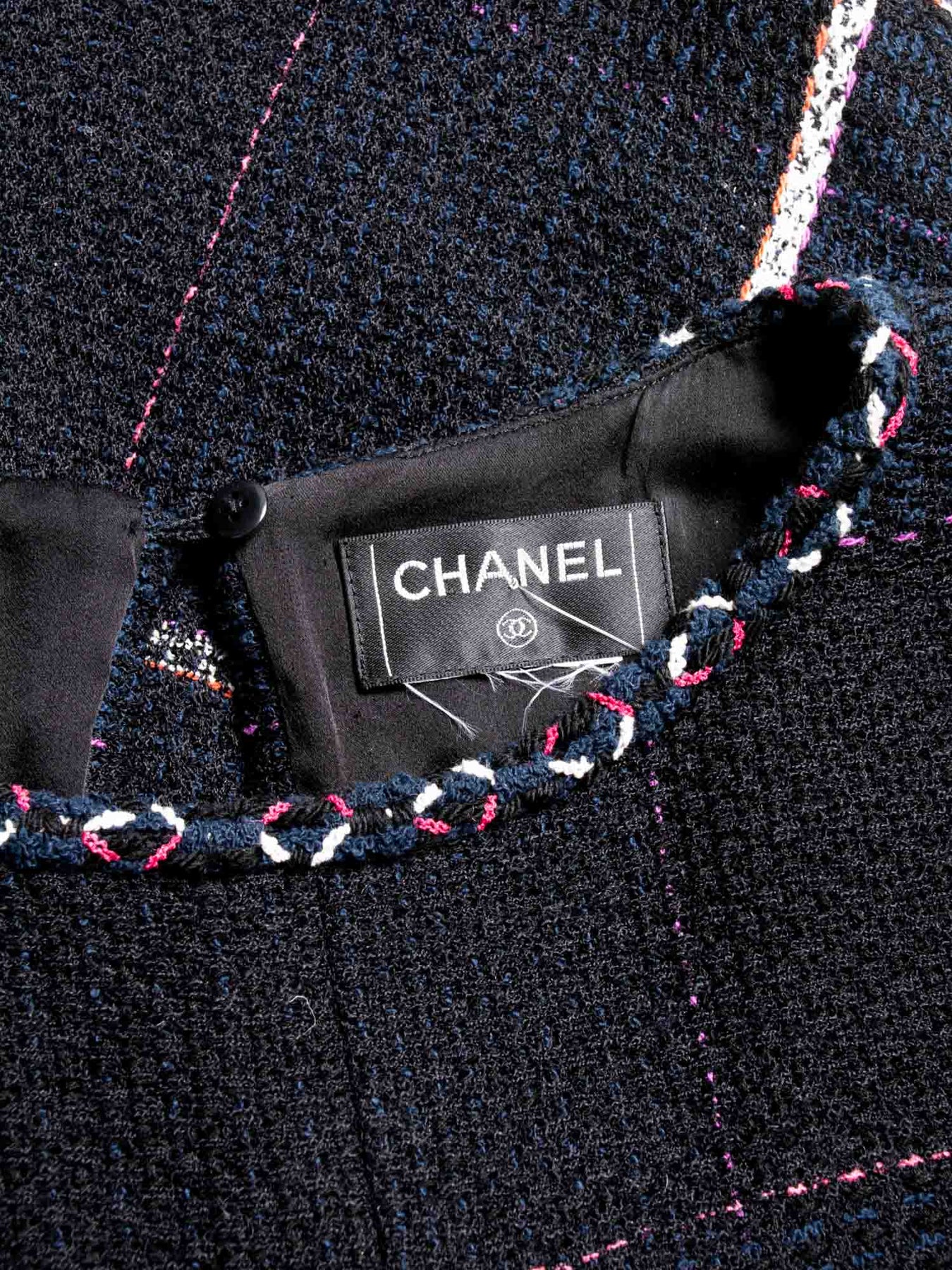 Chanel Top or . This sleeveless top features a navy blue, black, and pink design with two front pockets and a back CC logo button closure.