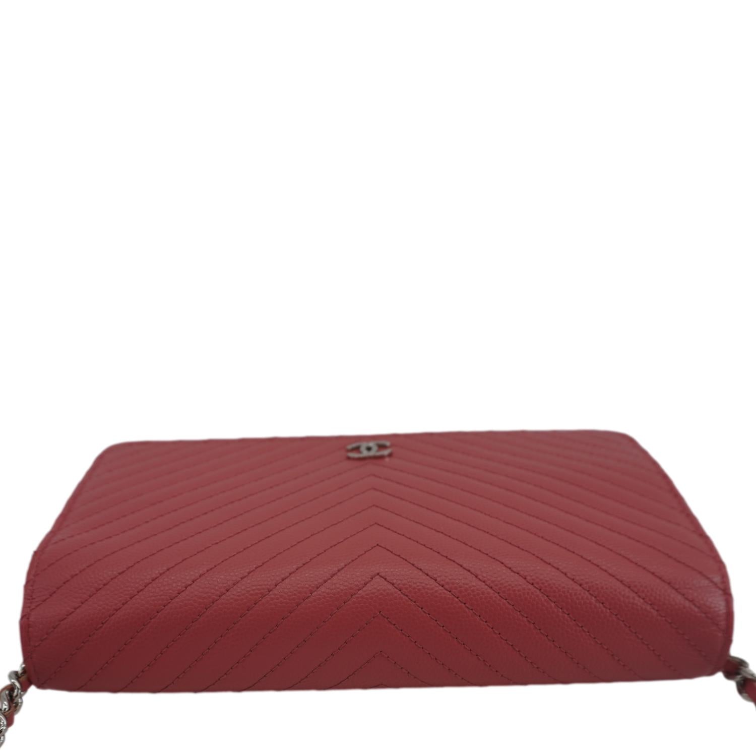 The Chanel Woc Quilted Leather Wallet on Chain Crossbody Bag in pink features luxurious quilted leather, a signature chain strap, and the iconic Chanel logo, offering a chic and versatile accessory for any occasion.