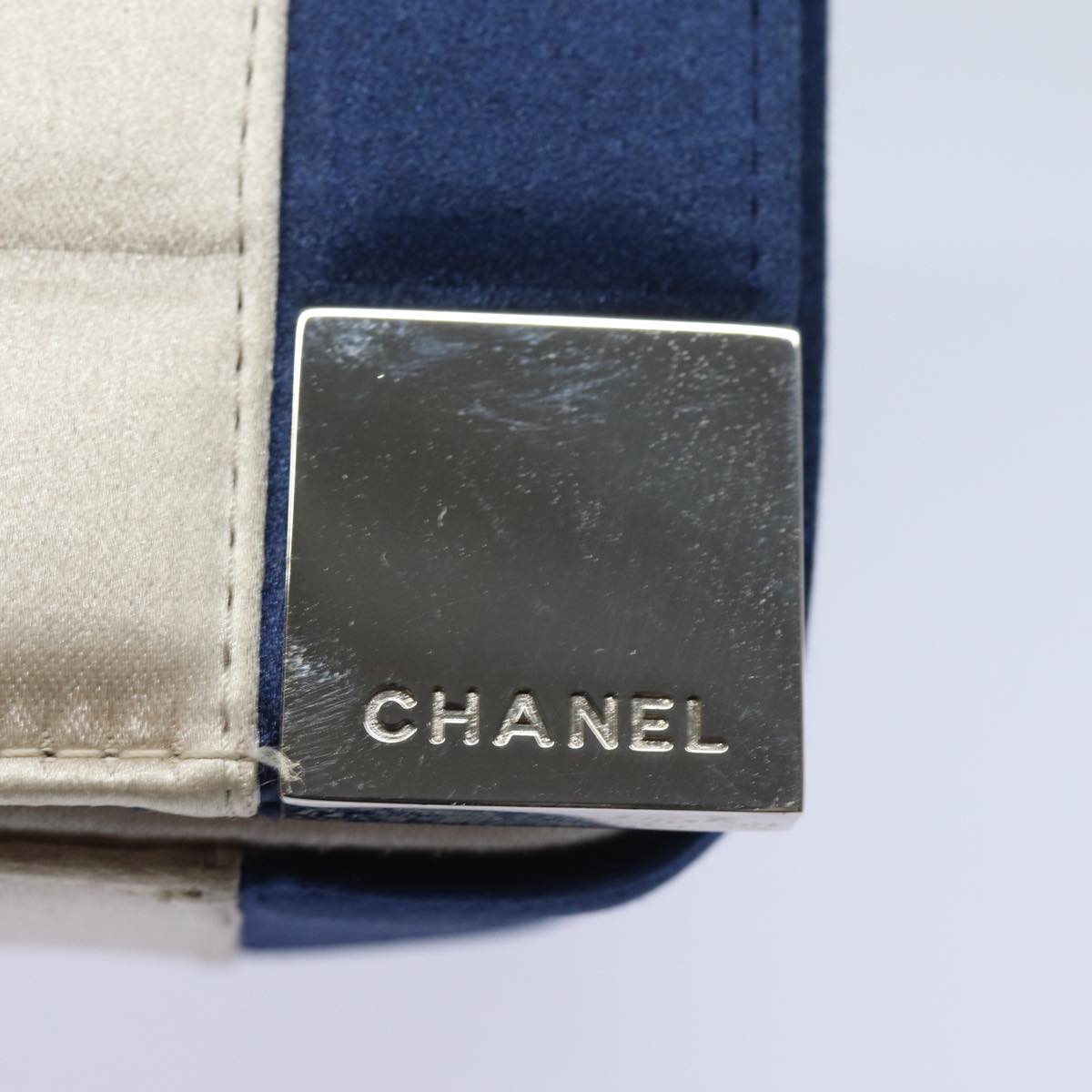 CHANEL Choco Bar Line Chain Shoulder Bag Satin Blue Beige CC Auth 84220