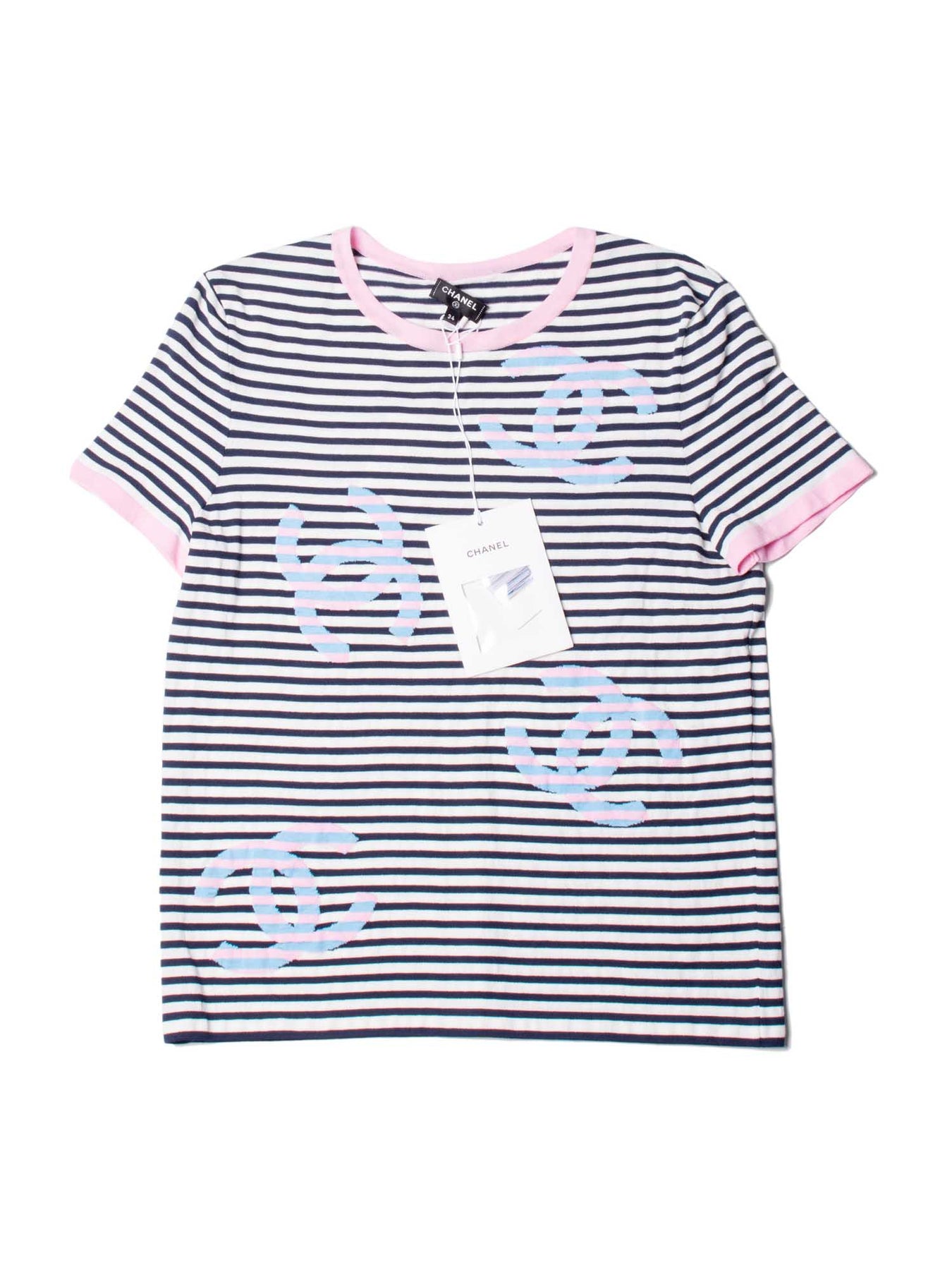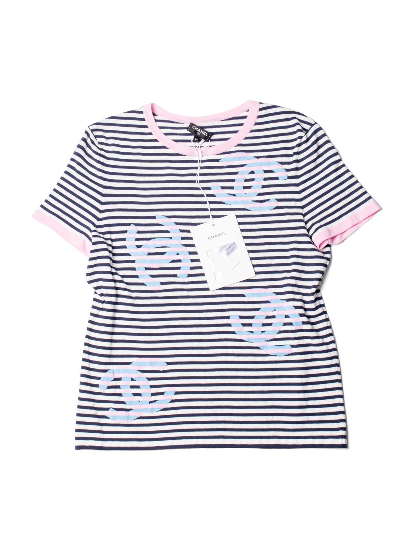 Chanel Cotton Stripe Top or . This top is in cotton with navy and white stripes. It features scoop neckline, pink and blue CC logo throughout the shirt, and pink trim. The perfect gift for Chanel lovers. Pairs perfectly with leather leggings or jeans!