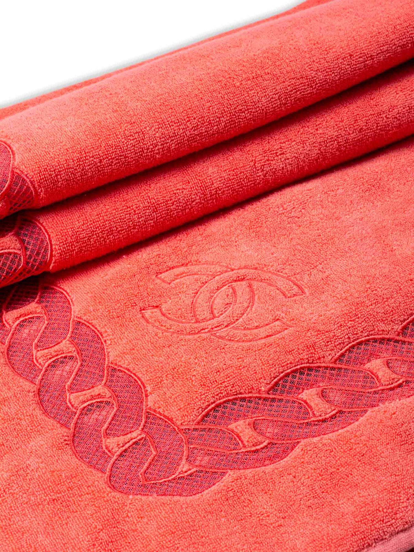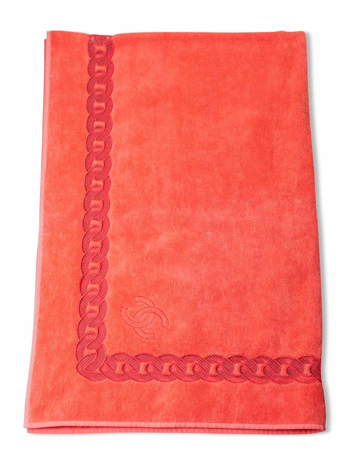 This beach towel is in lush salmon pink cotton fabric, featuring a CC logo on the front and the embroidered chain design throughout.