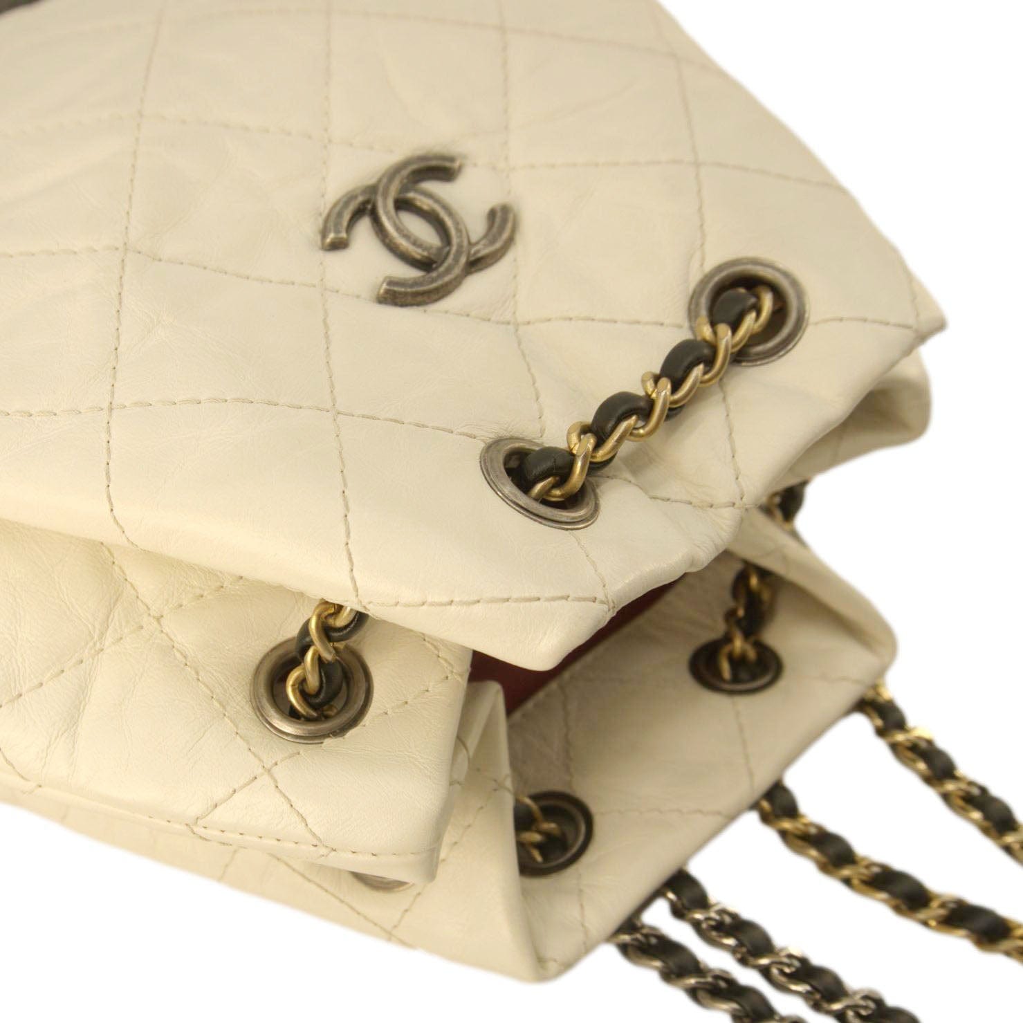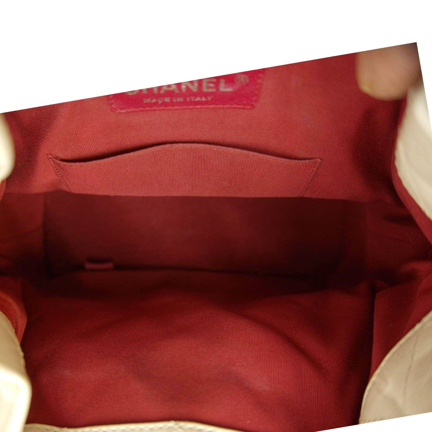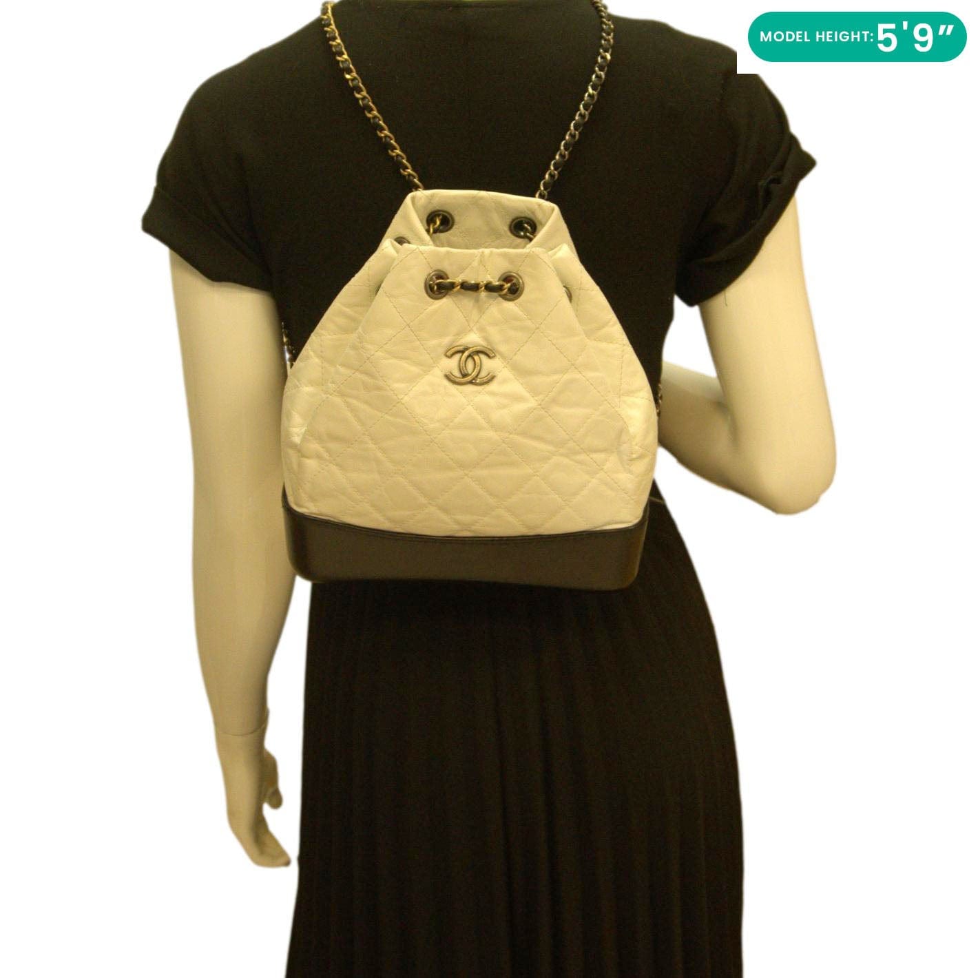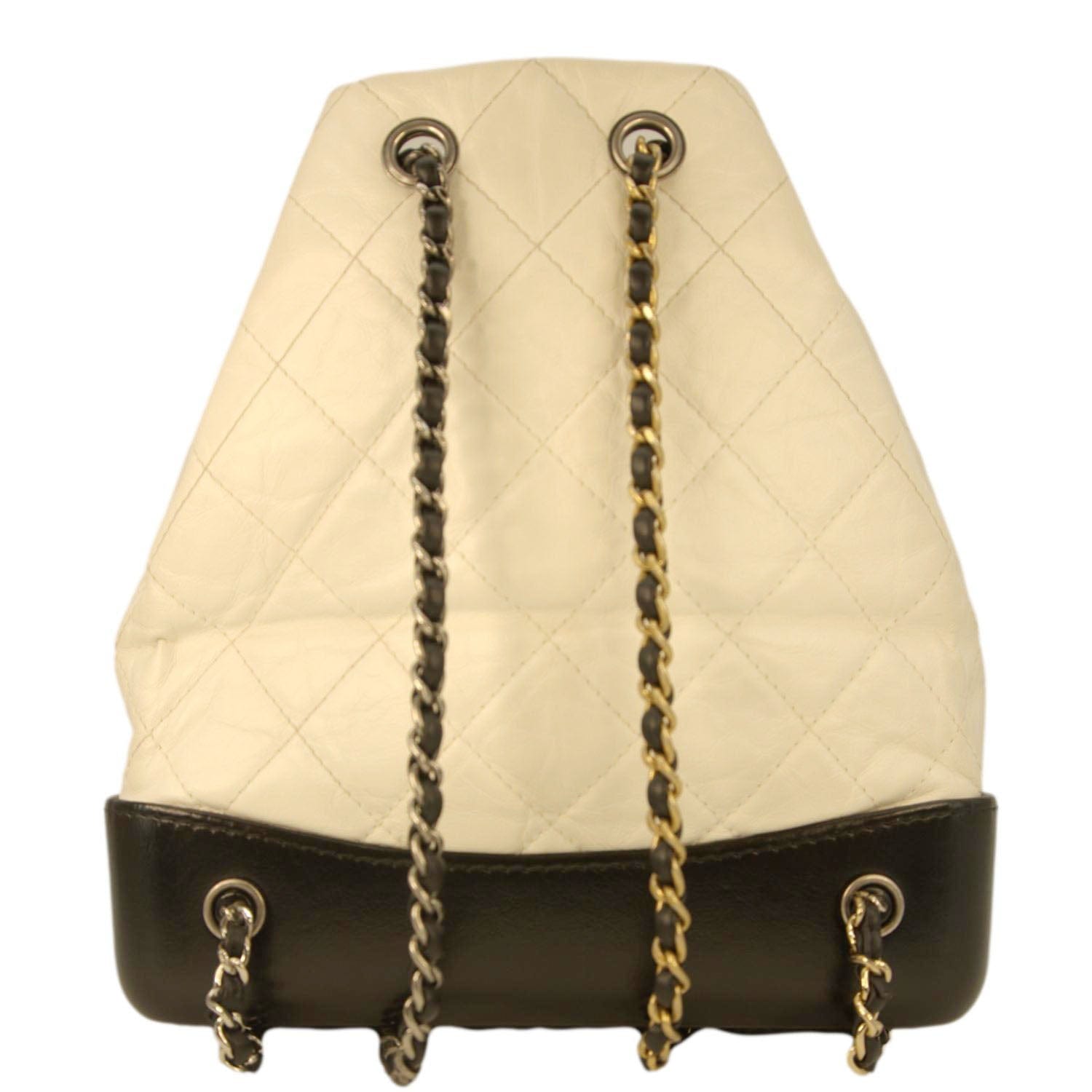 The Chanel Gabrielle Small Backpack in white quilted aged calfskin leather combines modern edge with classic sophistication. Featuring a unique structured base, adjustable chain straps, and the iconic CC charm, it’s a chic and versatile accessory for any occasion.