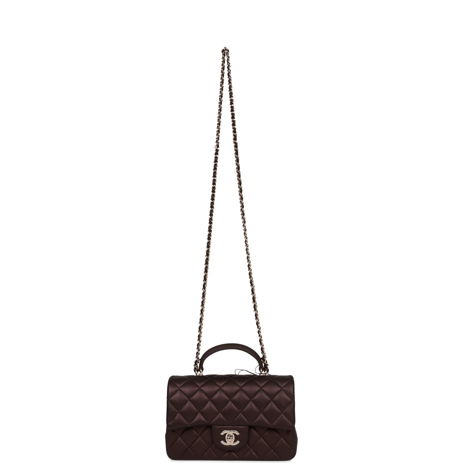 This Mini Rectangular flap bag is in burgundy lambskin with light gold tone hardware and has a front flap with signature CC turnlock closure, rear half moon pocket, top handle and single interwoven burgundy leather and light gold tone chain link shoulder/crossbody strap.