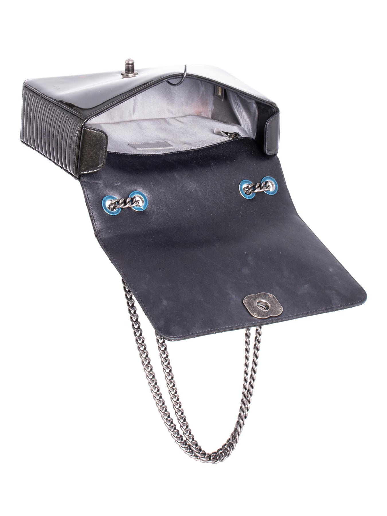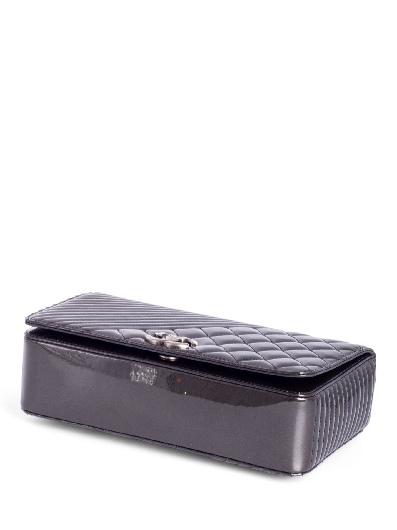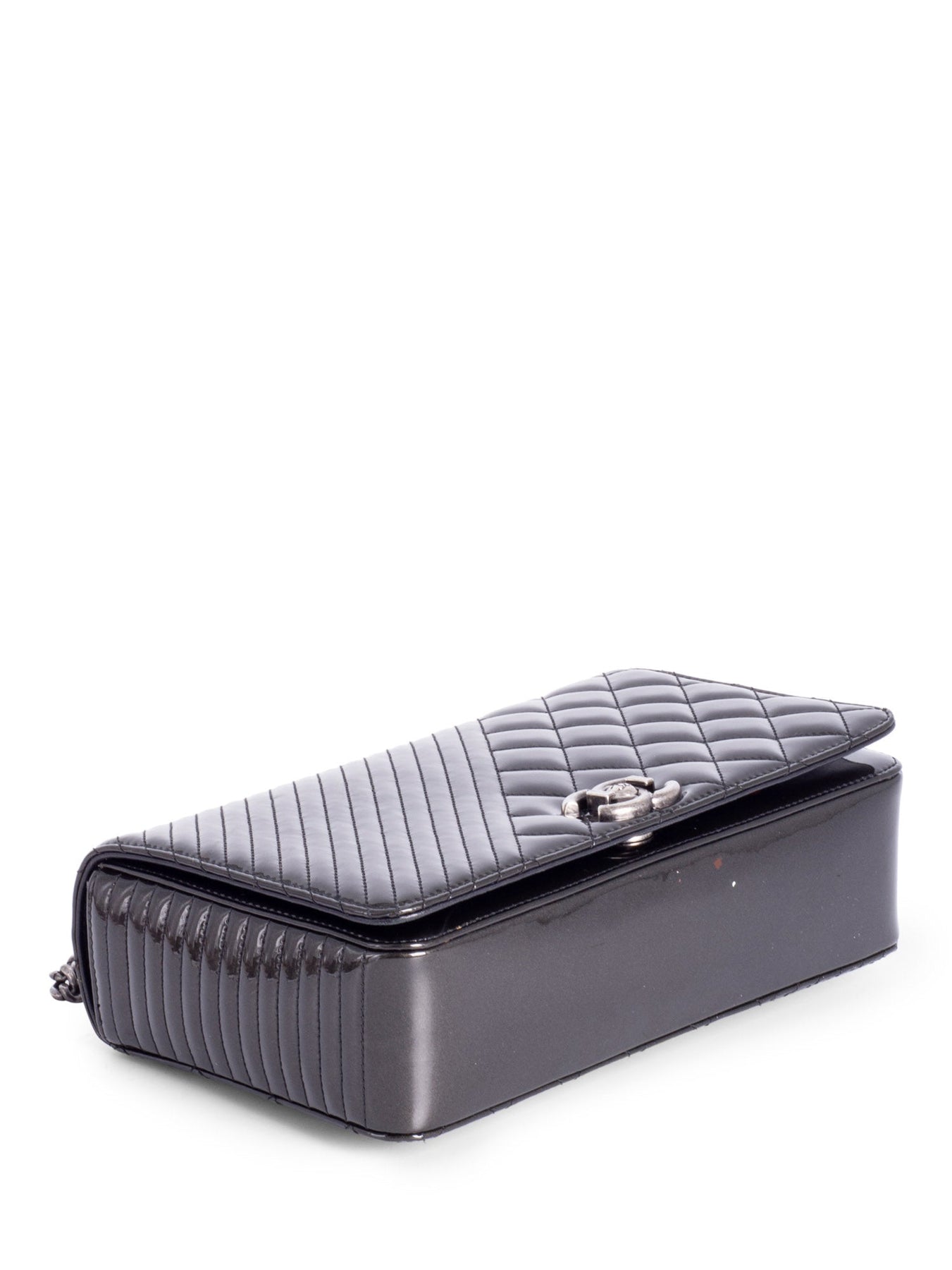 Chanel CC Logo Medium Leather Boy Bag or . This bag is crafted in black patent leather with an abstract quilted design, ruthenium hardware, and a chain strap. The bag features a CC logo push-lock front closure and grey lined interior with one zippered pocket.