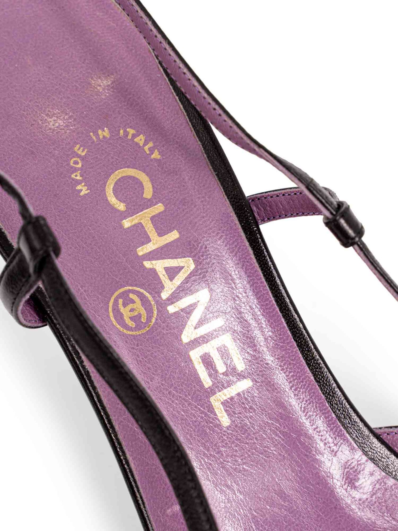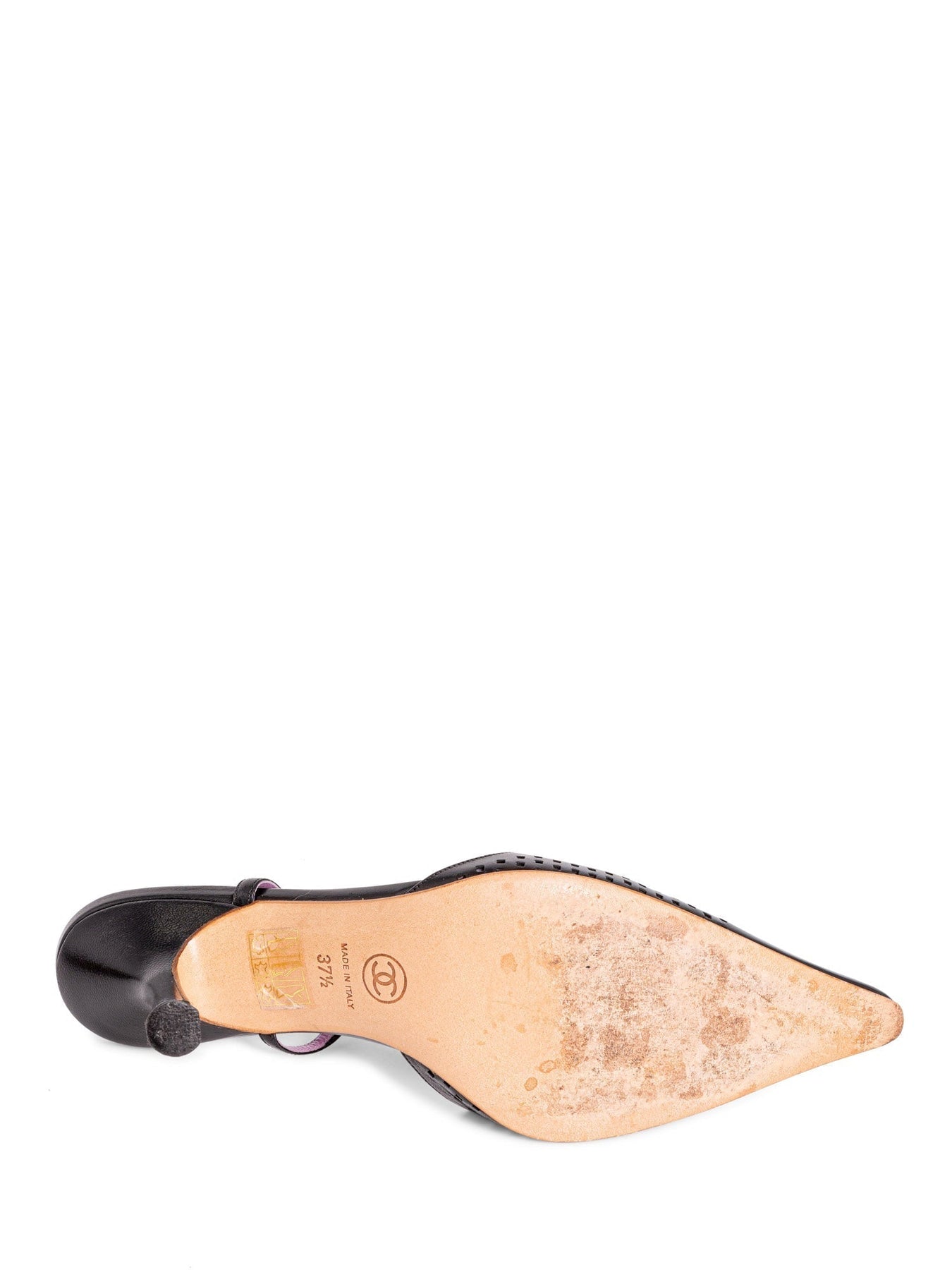 Chanel Leather Sling Back Shoes or . These Chanel shoes are in black perforated leather with CC accents, ankle straps and a 2.5" heel.