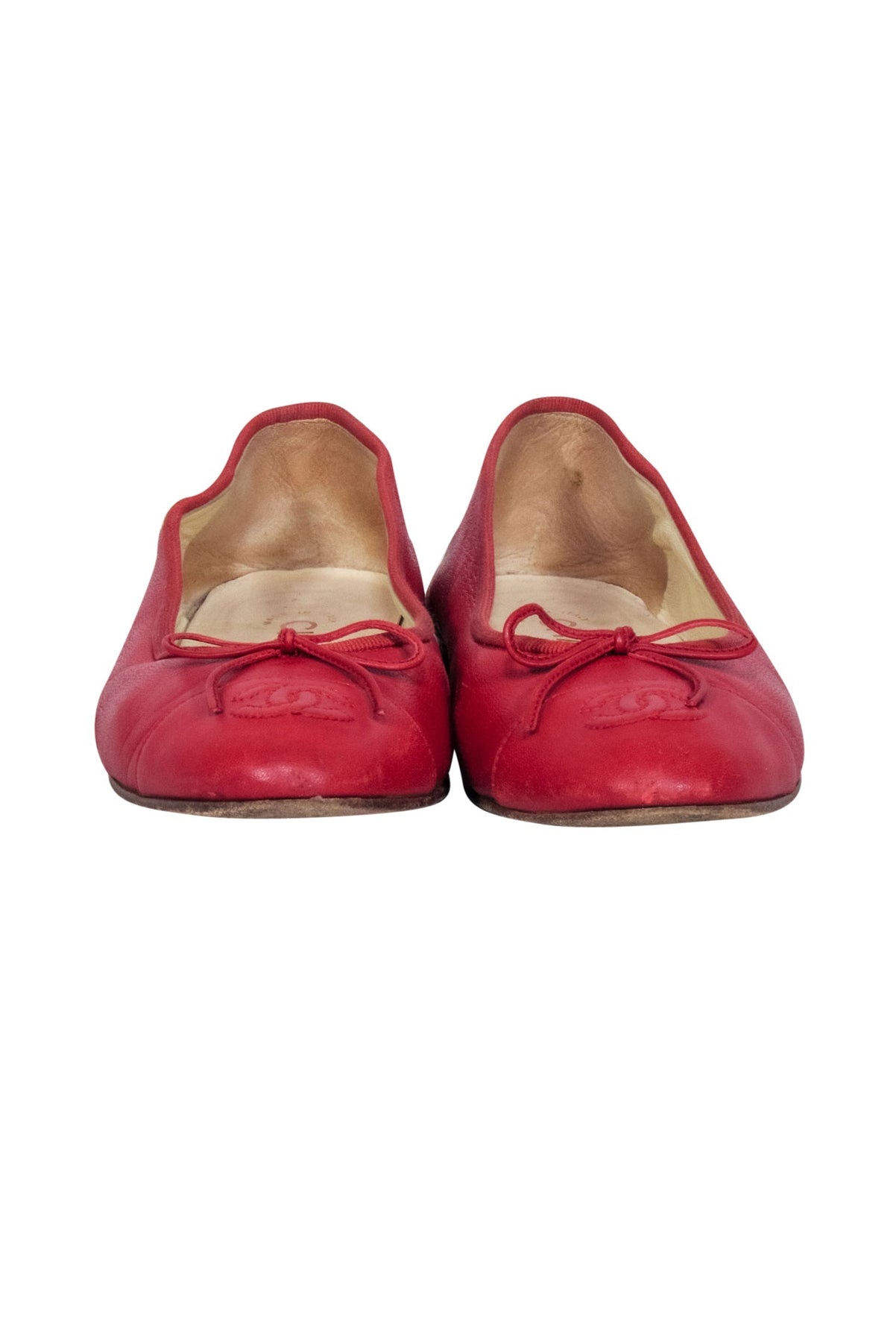 Step into sophisticated style with these ravishing red ballet flats from Chanel. Featuring a playful logo toe and delicate bow detail, these flats are perfect for adding a touch of fun to any outfit. Pair with a chic tweed skirt set and a red leather bag for a fashionable office look.