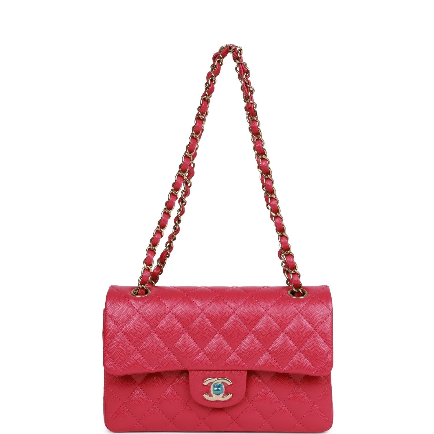 This Small Classic Double Flap bag is in fuchsia caviar leather with light gold tone hardware and features a front flap with signature CC turnlock closure, half moon back pocket, and adjustable interwoven light gold tone chain link and fuchsia leather shoulder strap.