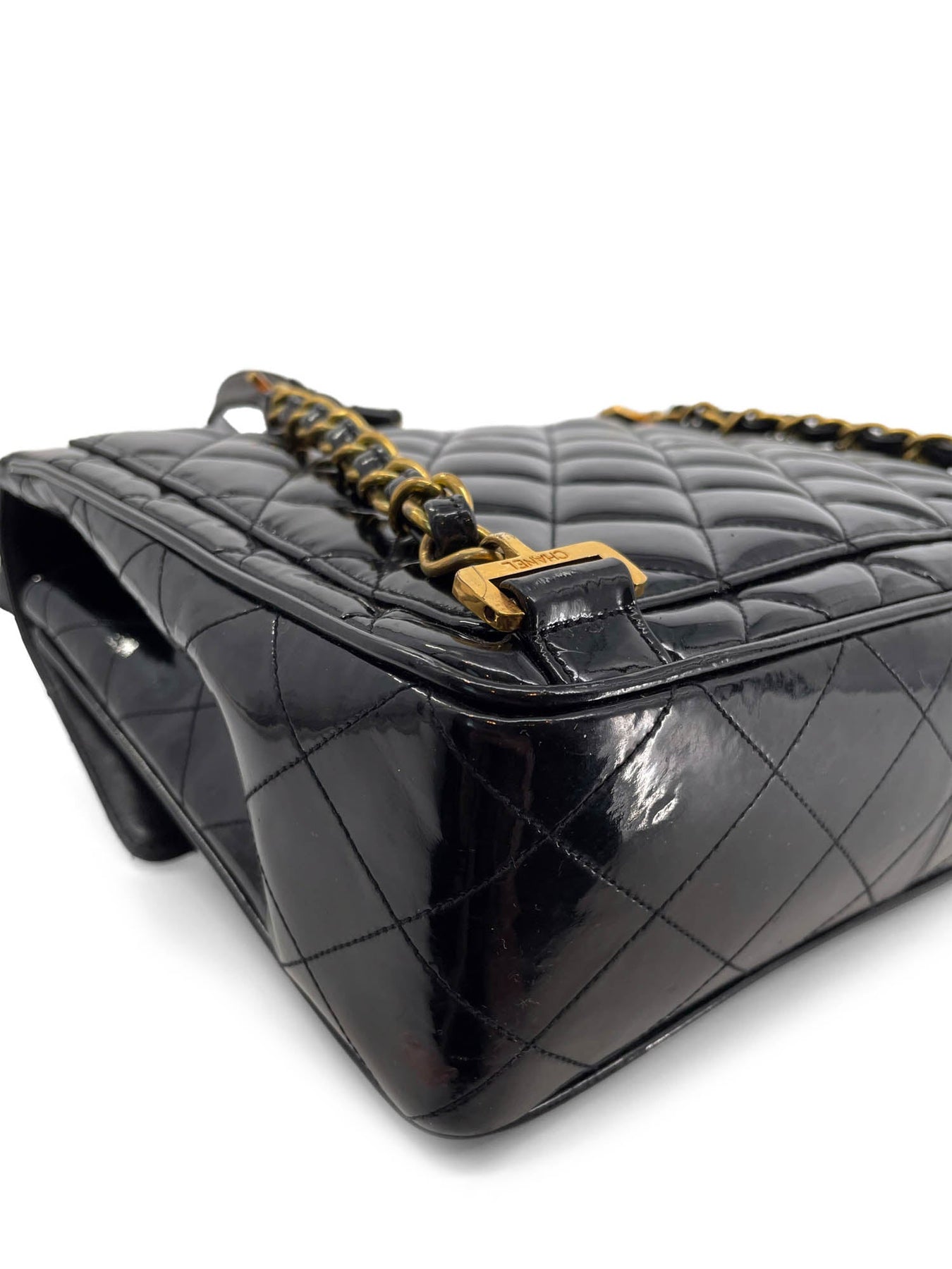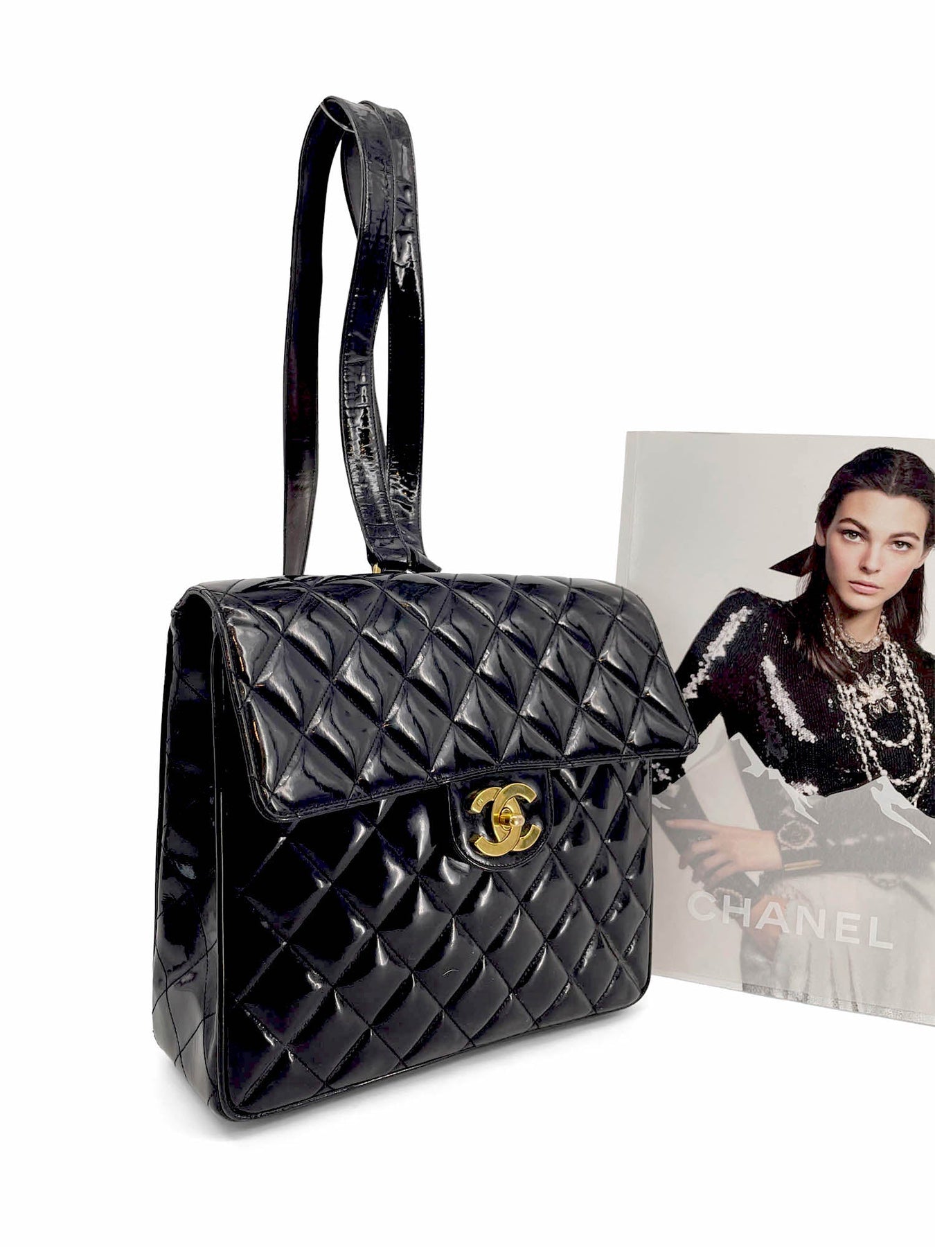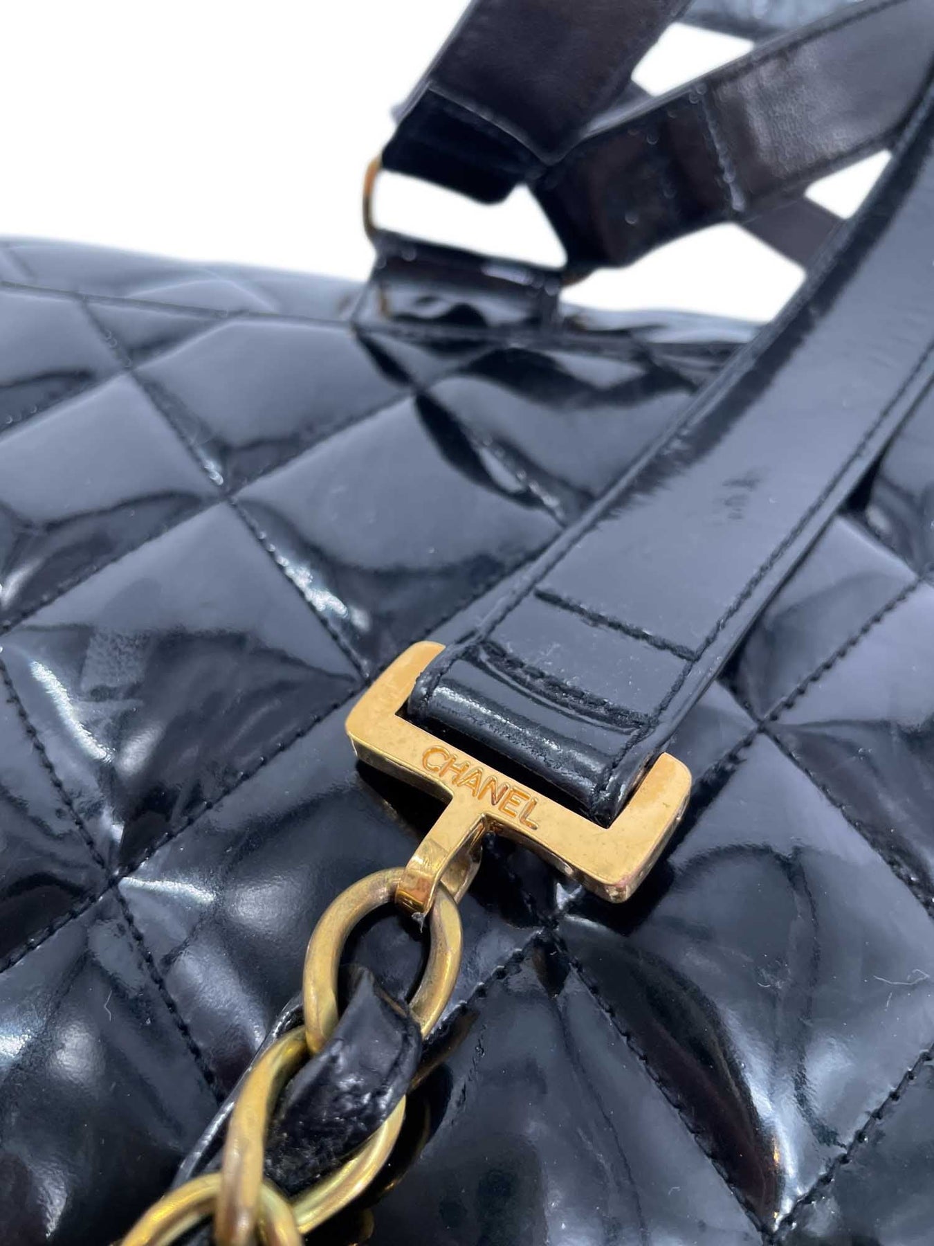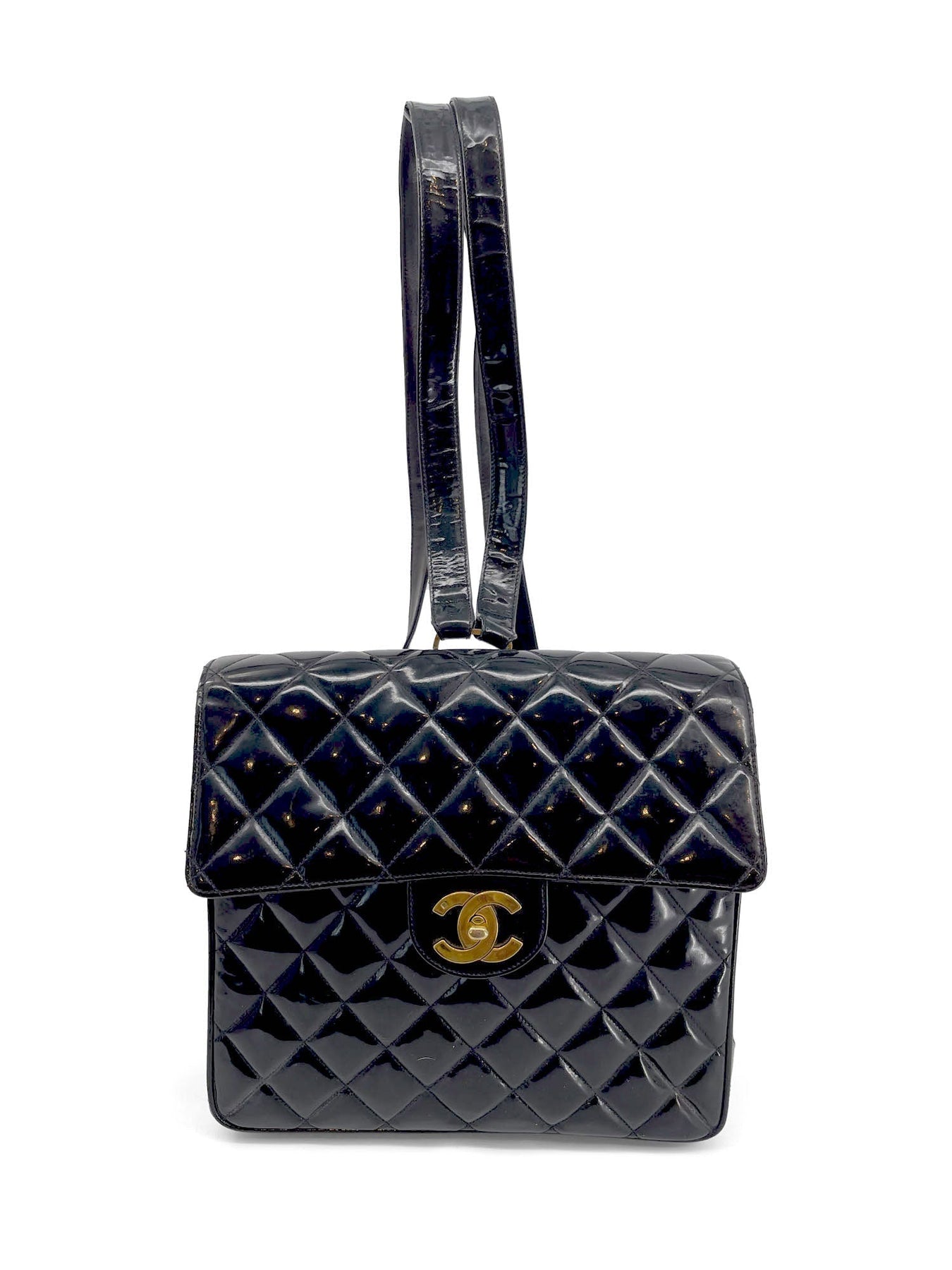 CHANEL Backpack or . This bag is crafted in black patent leather, featuring 24k gold hardware, signature CC logo twist closure, two interior pockets (one with a zipper) and one open pocket outside . The interior is in black leather to compliment the exterior