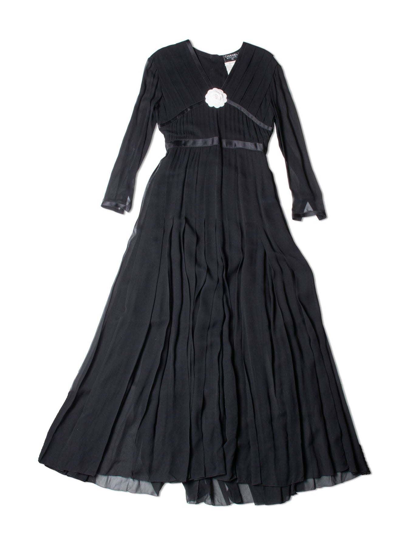 Chanel maxi dress or . This Chanel dress is in black silk and features a v neck, pleating throughout, and a back button and zip closure.