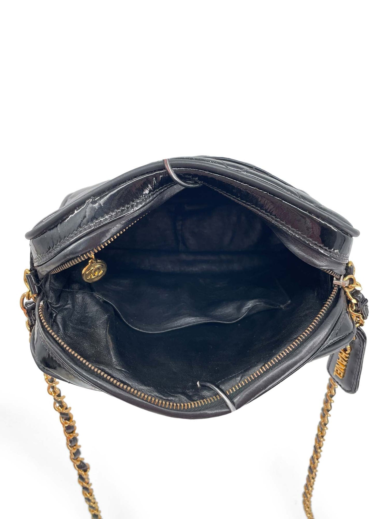 CHANEL Vintage Quilted Patent Leather 24k CC Logo Camera Bag or . This Chanel camera bag is in black patent leather with front pocket. It features 24k gold hardware, CC logo zipper and CC gold turn lock closure. This beautiful bag opens to black lambskin leather interior with zipper patch pocket.