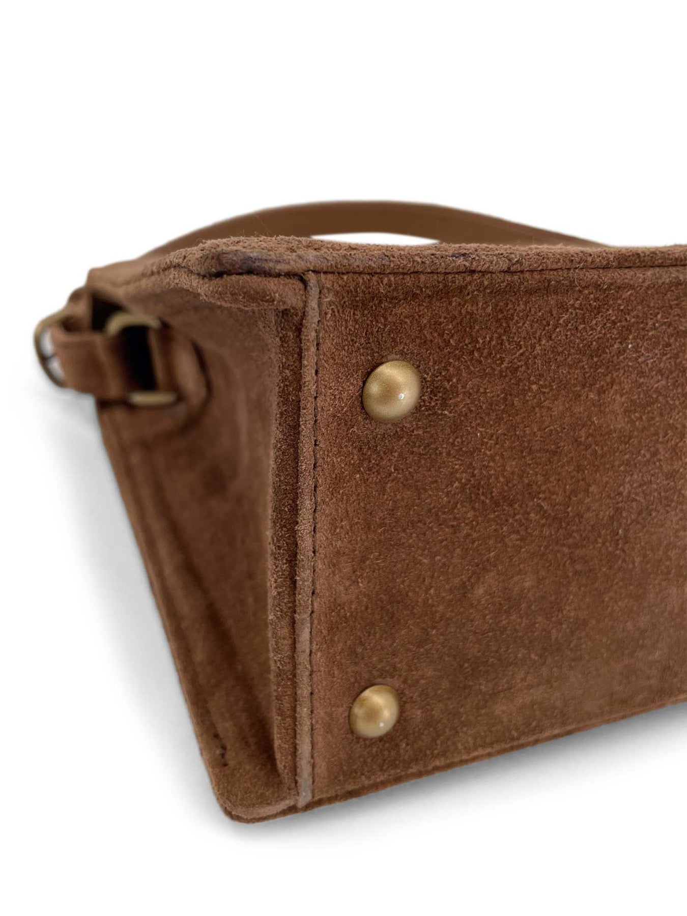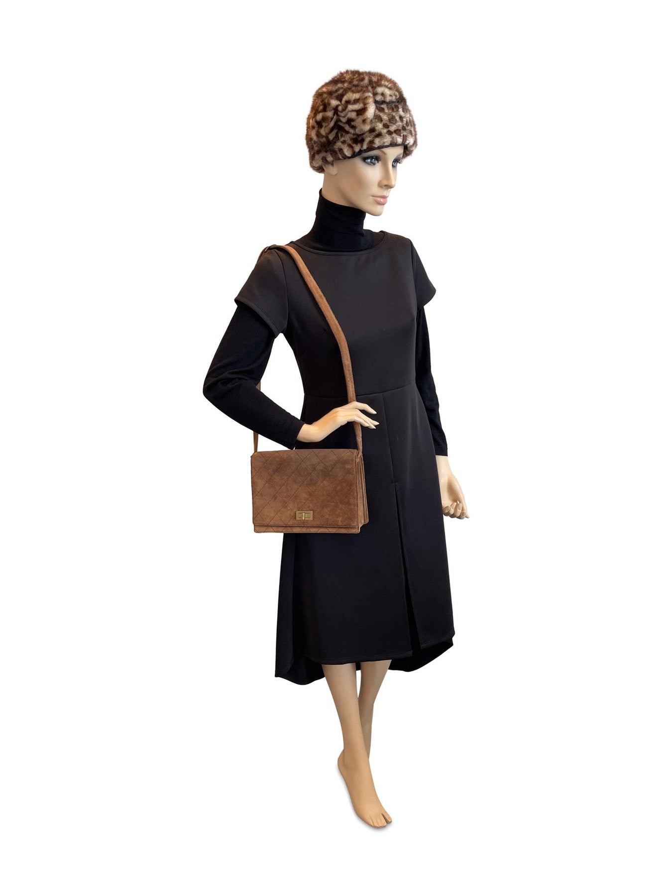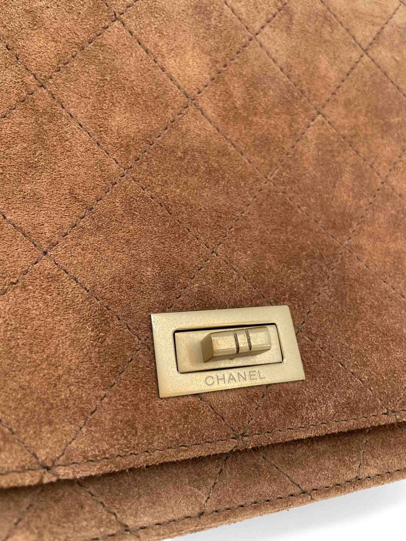 Chanel Messenger bag or . It features brown quilted suede leather with gold hardware, suede leather shoulder strap, Mademoiselle Twist Lock with CHANEL logo on front flap, single exterior pocket, brown leather lining, two interior pockets; one with zip closure and one open pocket.