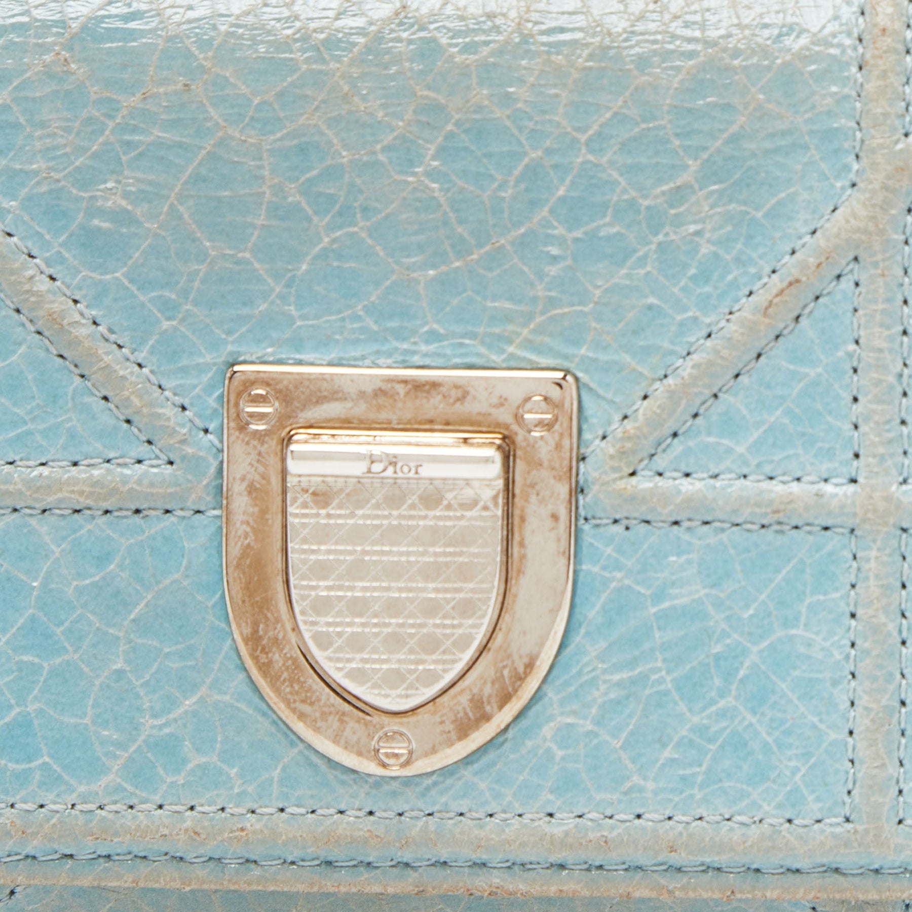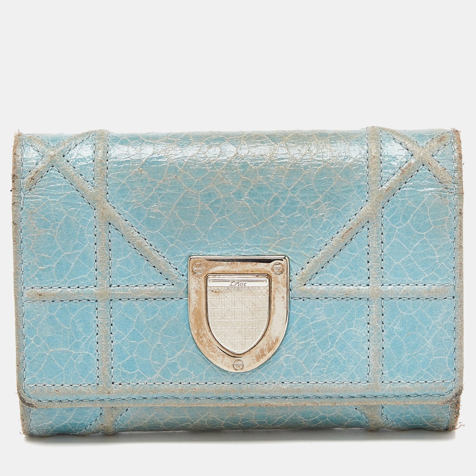 Match your Dior bags with the elegant Diorama wallet. Crafted in blue crinkled leather, this wallet features the signature lock in silver tone hardware. The press lock opens to an organized interior to neatly carry your necessities.