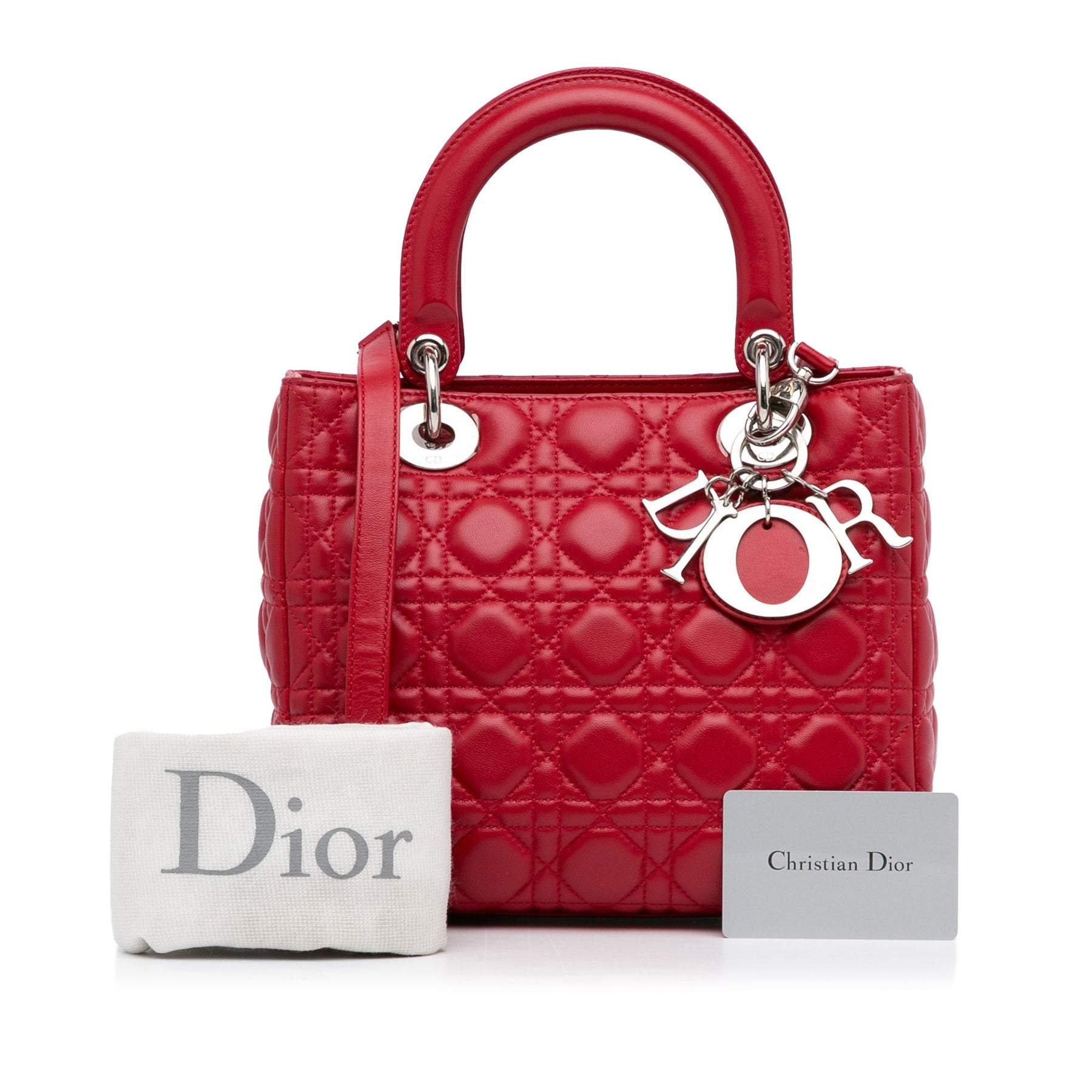 Die Lady Dior Taschenlinie von Dior ist zu Ehren der ehemaligen Prinzessin von Wales, Prinzessin Diana, benannt. Diese Dior Lady Dior in der Grösse Medium ist aus rotem, gestepptem Cannage-Leder gefertigt und verfügt über silberne Details und Dior-Anhänger, einen mehrstufigen Reissverschluss an der oberen Öffnung und ein Reissverschlussfach im Inneren. Die Tasche wird in der Hand und am Arm getragen.