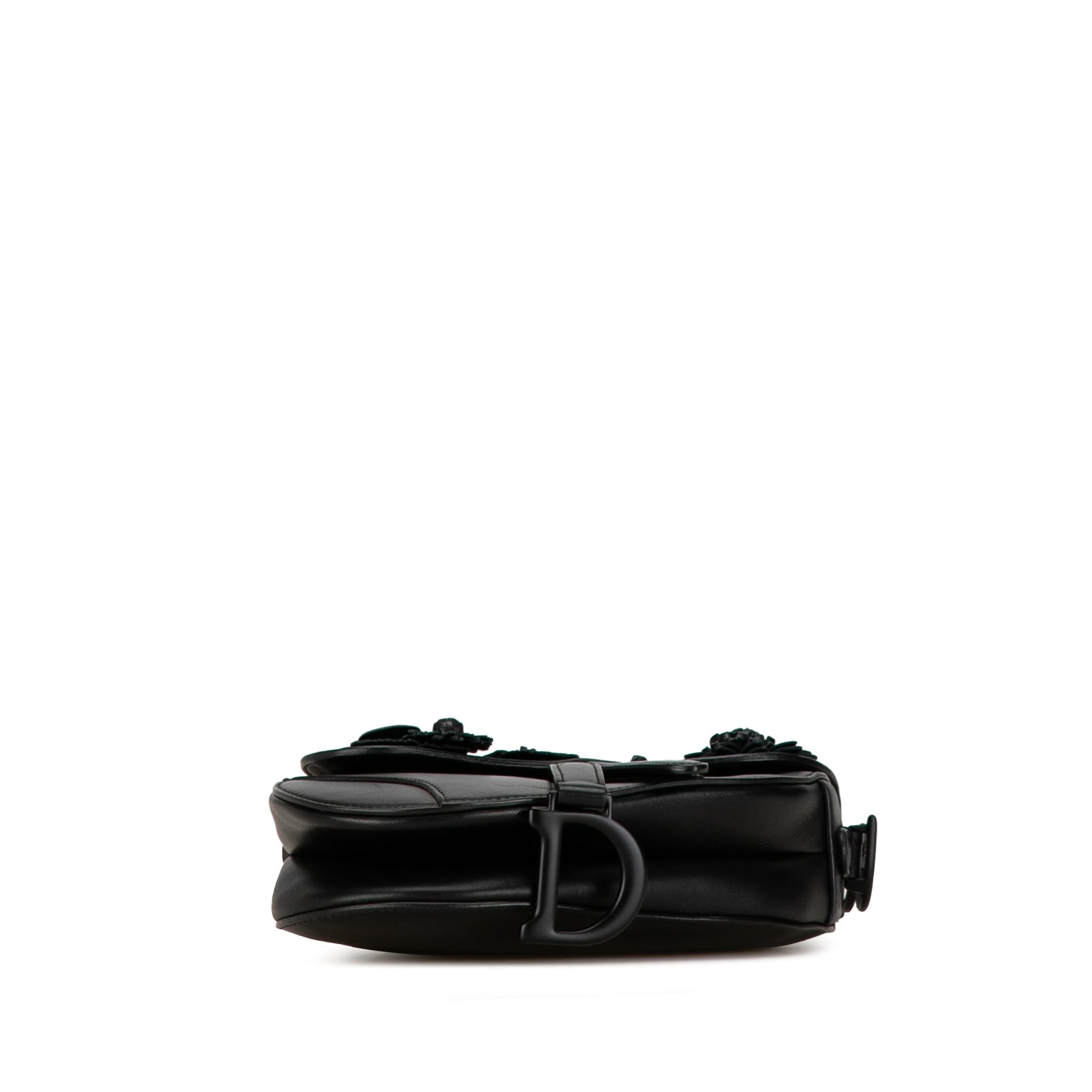 Indulge in the luxurious lambskin leather and elegant floral appliques of the Saddle bag, complete with a sleek flat leather handle and front flap secured by a magnetic snap closure.