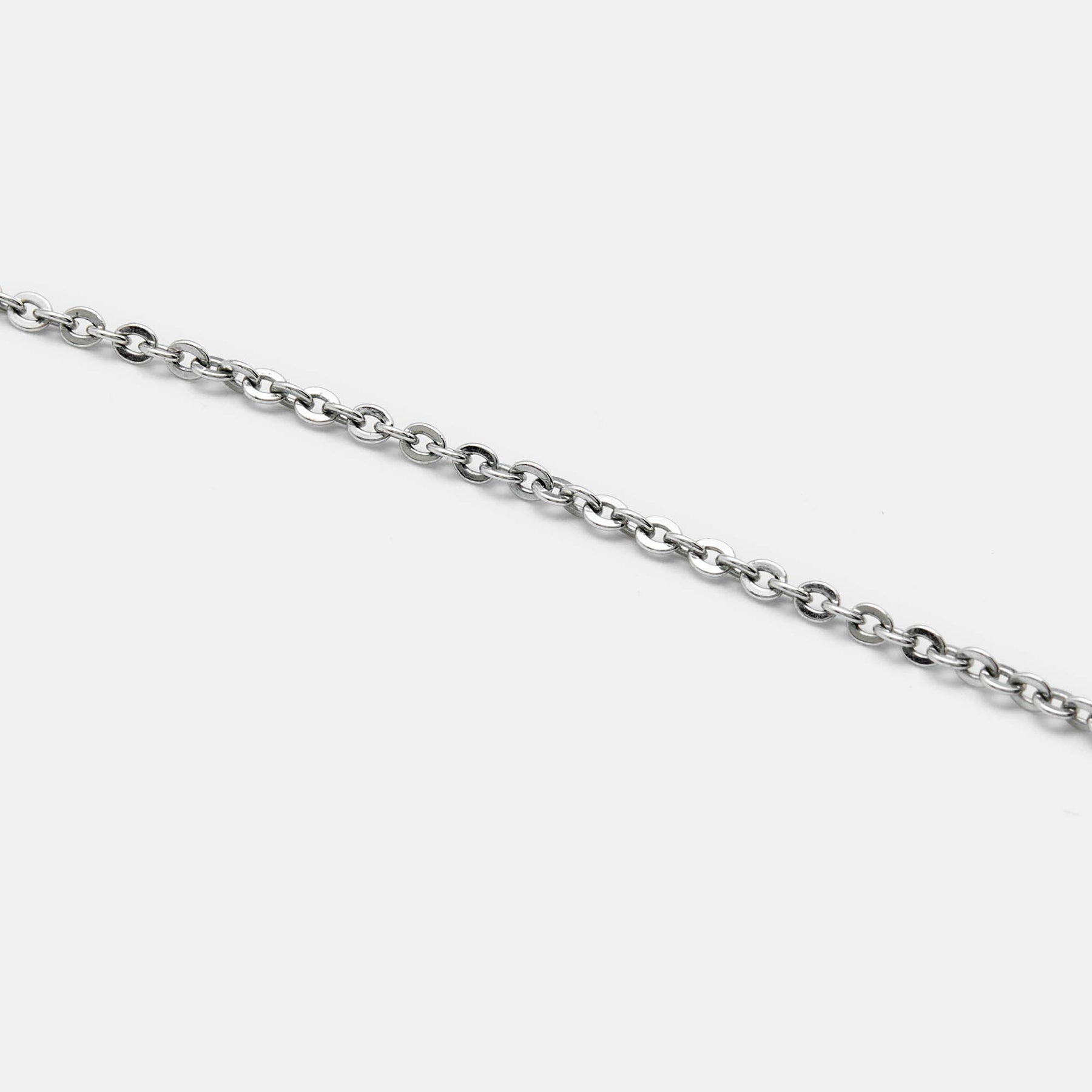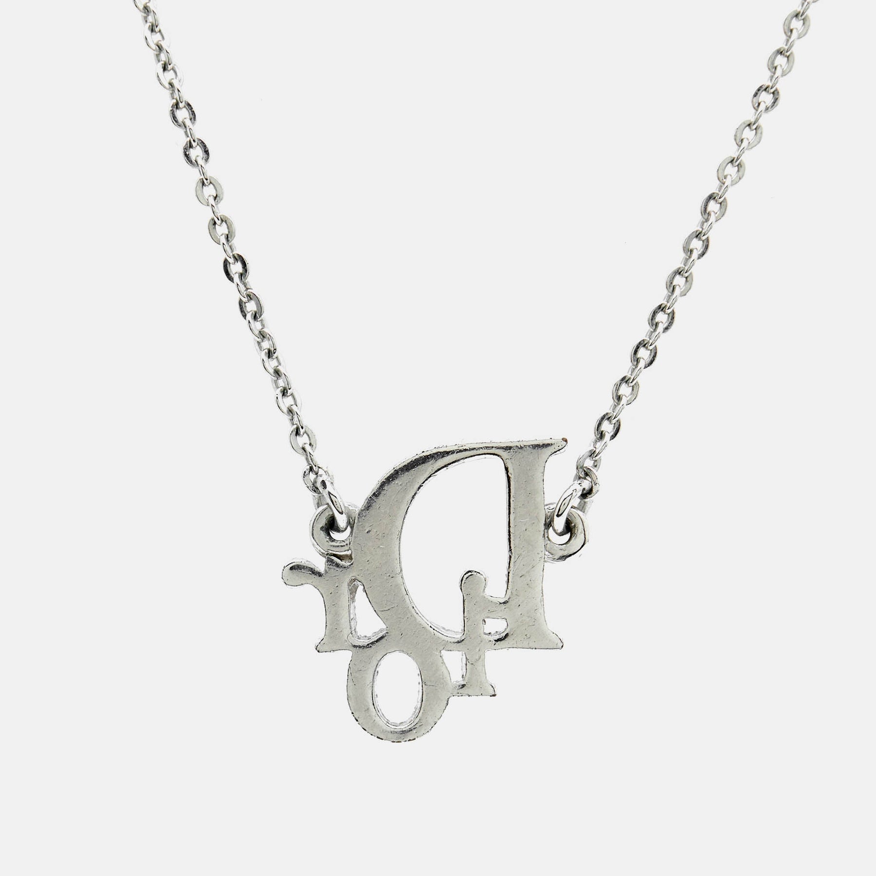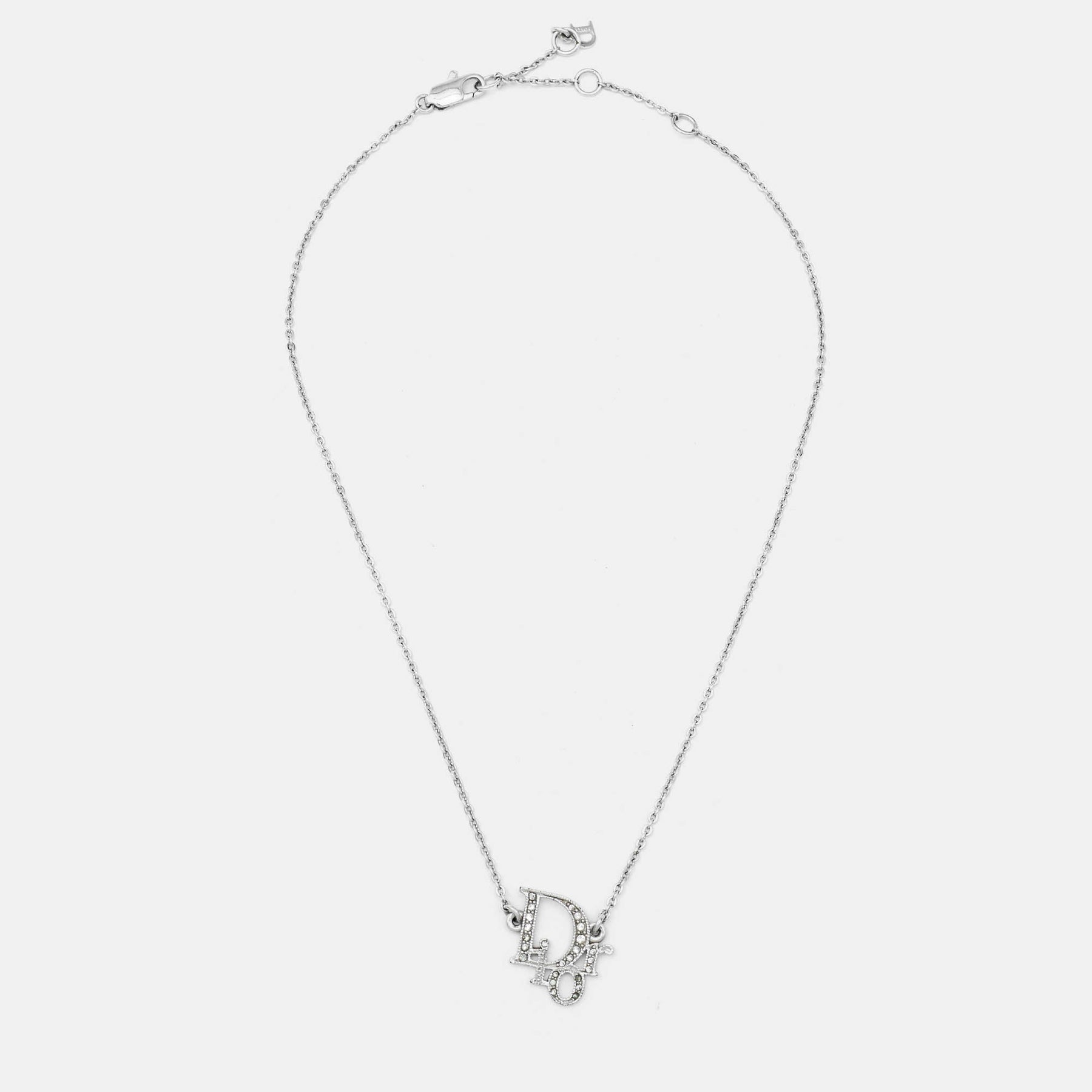 This silver tone necklace from Dior features a sparkling pendant suspended on a slender chain. Gracefully designed, the pendant is crystal encrusted D.I.O.R lettering. Its design is completed with a silver tone medallion dangling from the lobster clasp.