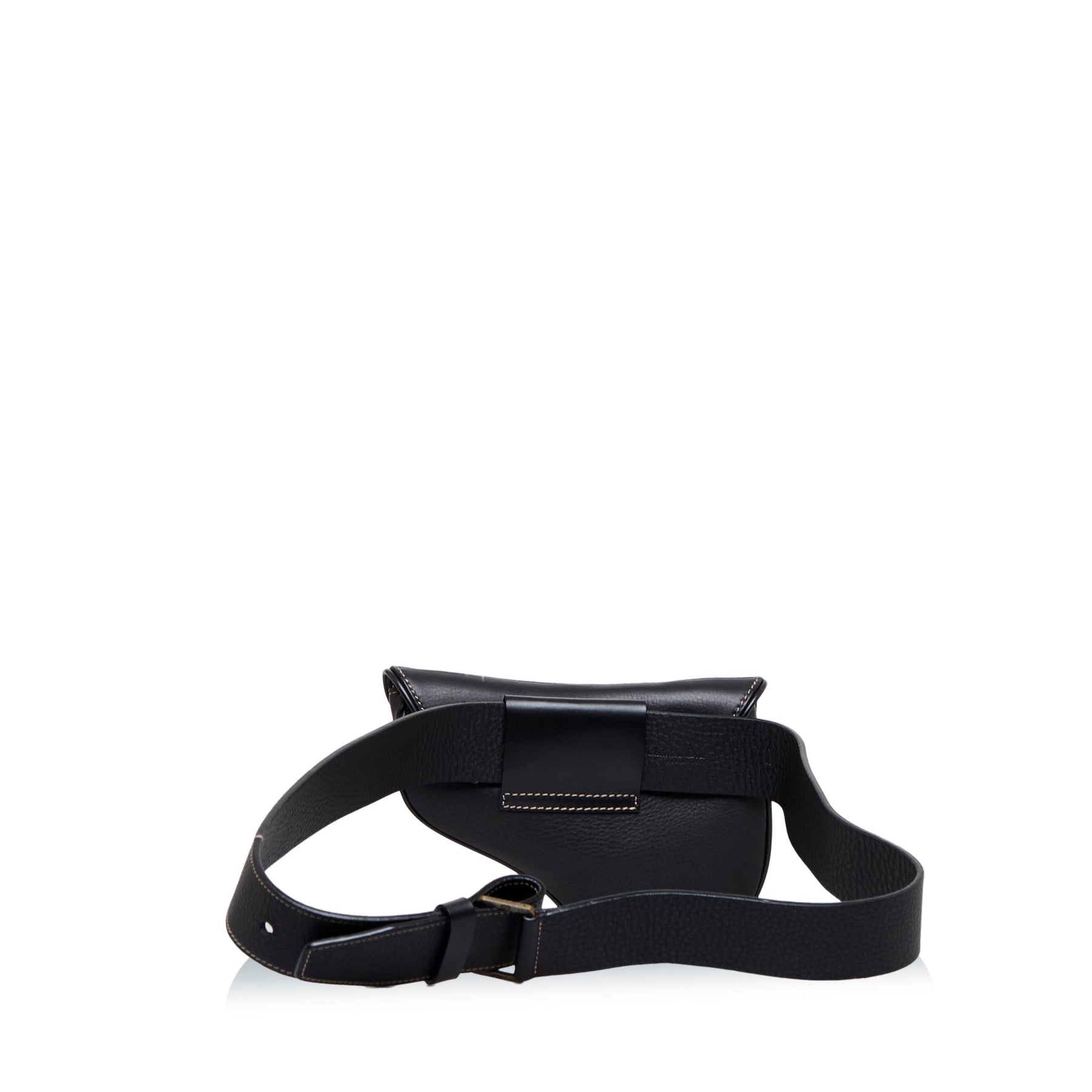 Saddle belt bag was made of black leather. It is around the waist by the belt strap and has a front flap with magnetic snap closure. The gold-tone hardware gives the Bag that certain something.