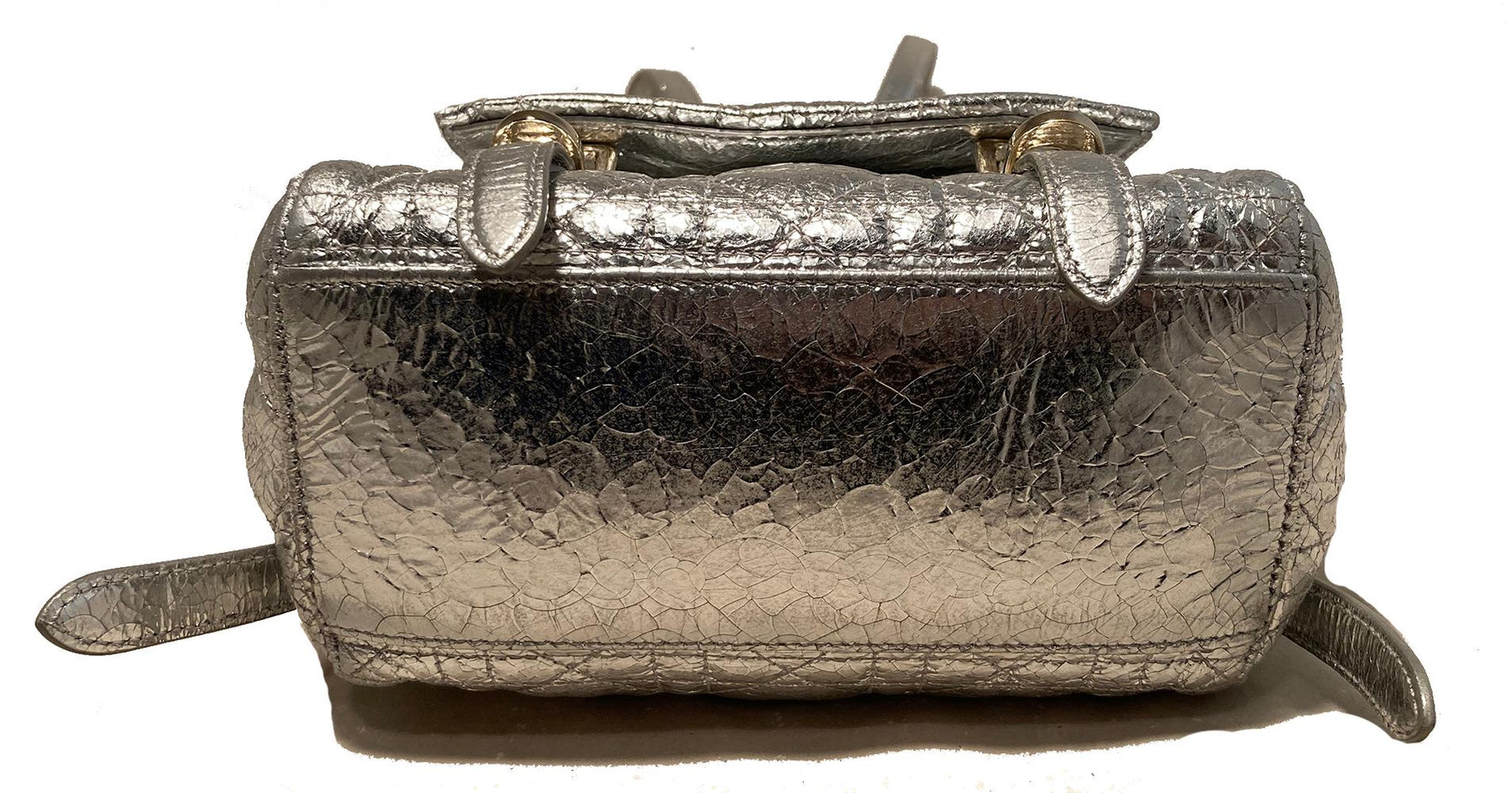 Silver crackled patent leather exterior quilted in classic dior cannage style and trimmed with silver hardware.