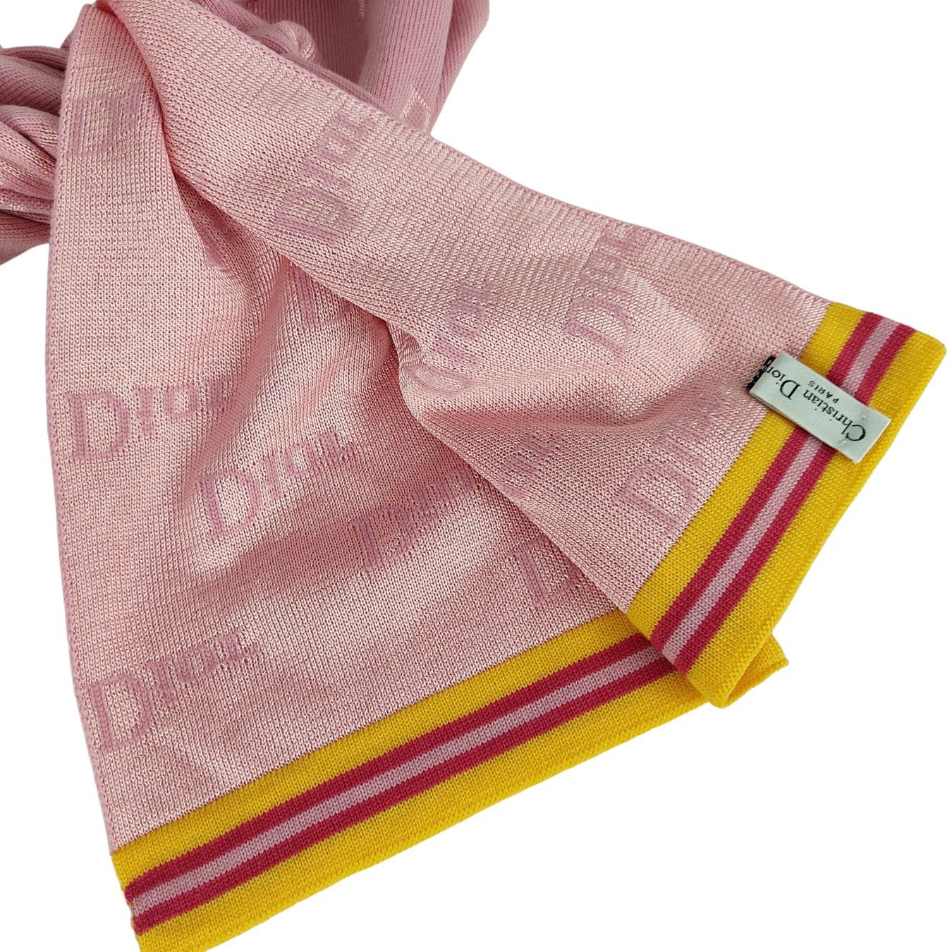 Dior women's scarf in wool blend.Pink in color with logo embroidered on the entire surface in shiny fabric.Decorated with yellow and fuchsia bands.It shows no obvious signs of wear and is in New overall condition.DIMENSIONS: W: 175cm - H: 35cmCODE: 5222A65BRAND: Christian DiorMADE IN: ItalyPink colorMATERIAL: 55% wool - 45% viscoseCONDITION: New
