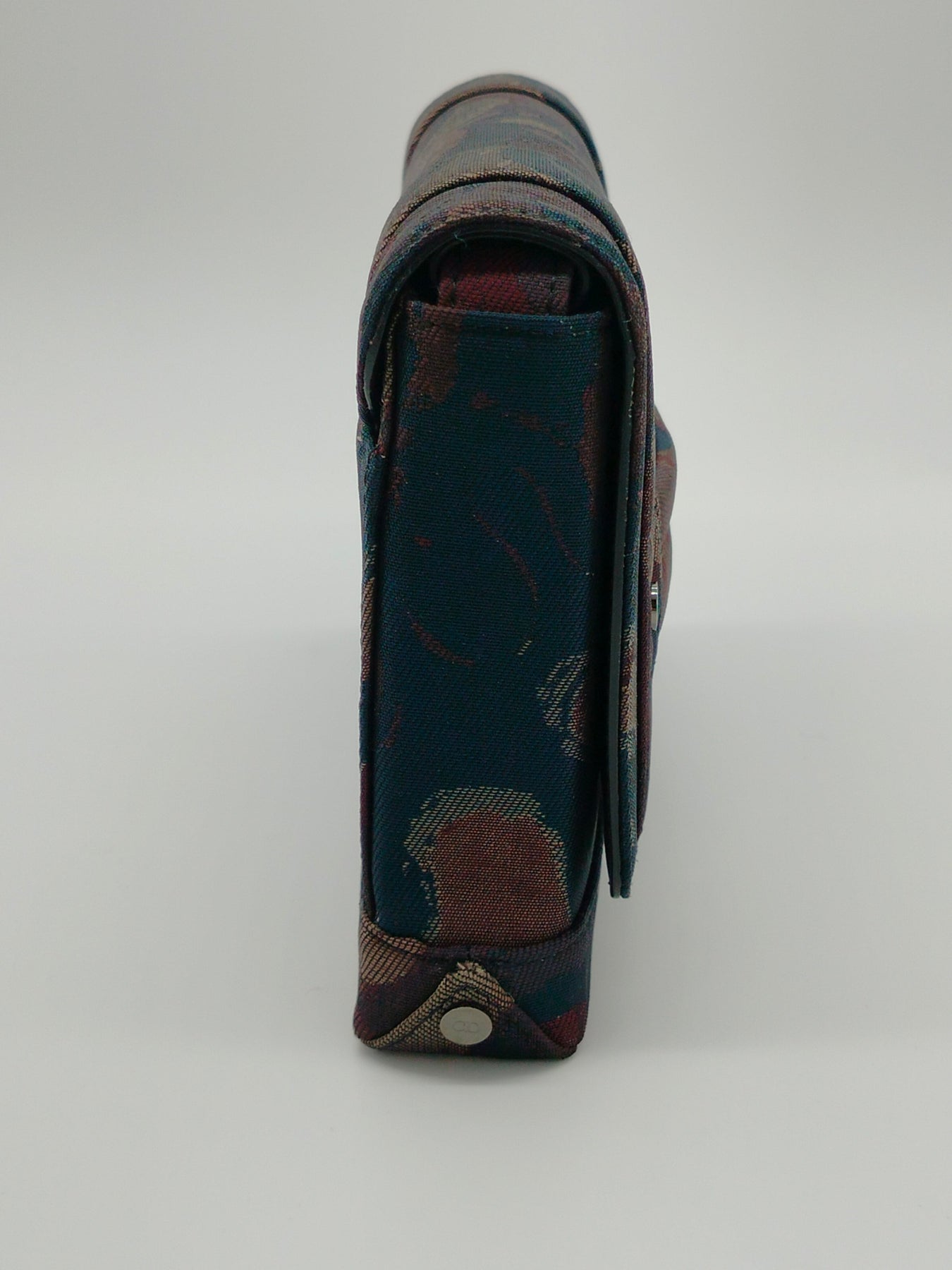 This shoulder bag features a printed canvas body, an adjustable flat strap, a front flap with magnetic closure, and an interior slip pocket.