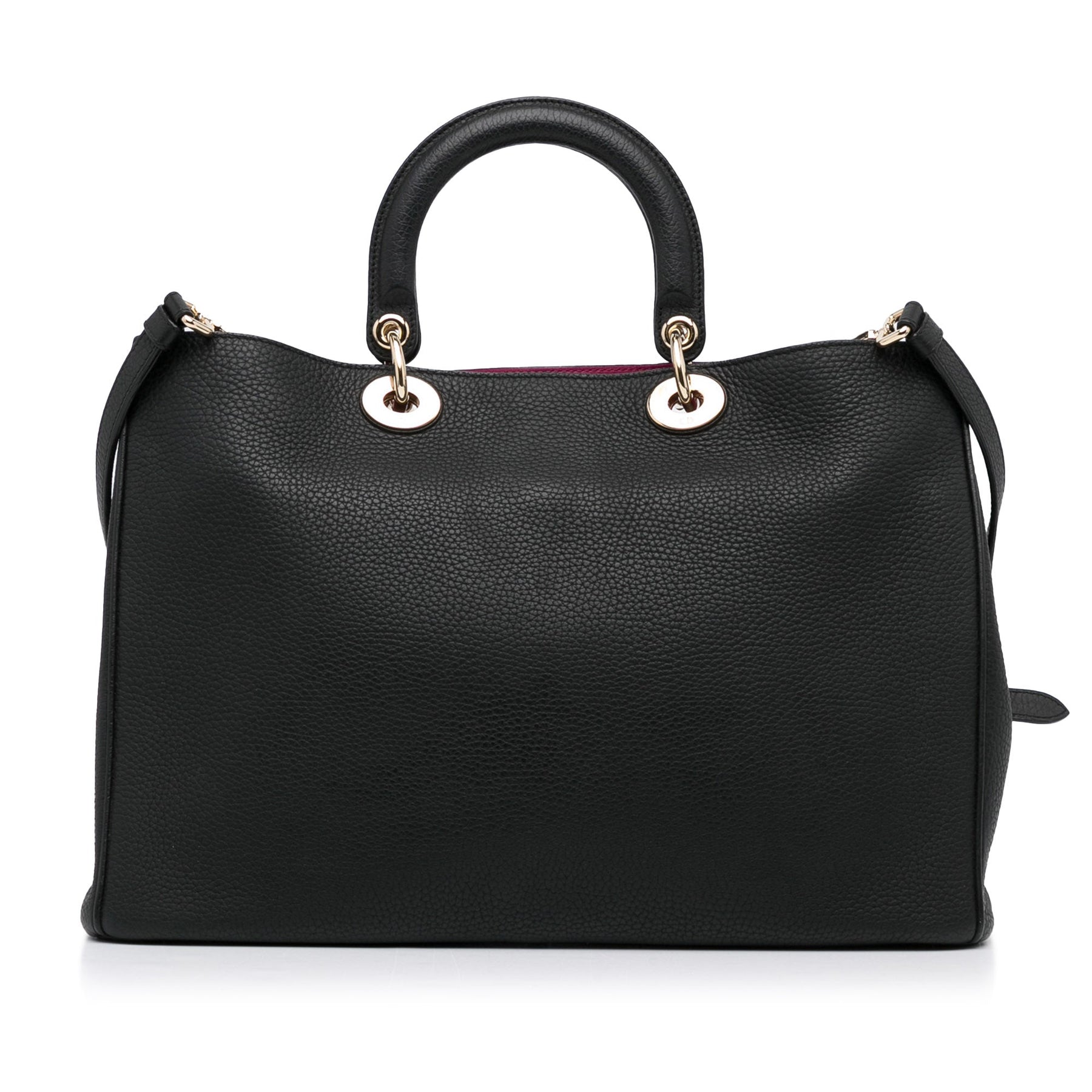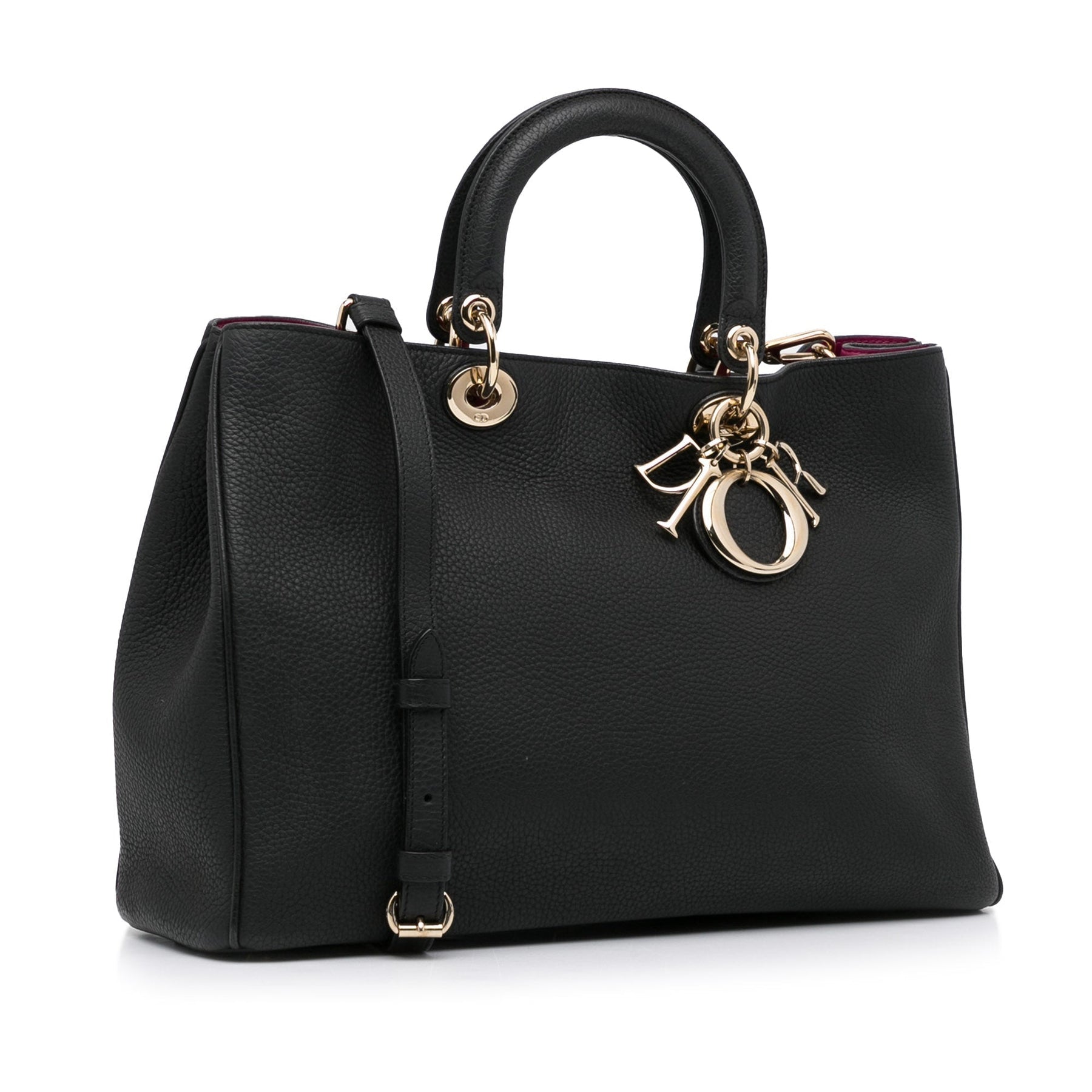 The Diorissimo is made of black leather. It is carried by the flat handles in the hand or on the arm. Or crossbody thanks to the removable shoulder strap. The top is open with a magnetic closure. In the pink interior offers the Bag Slip pockets and it comes with a pochette.