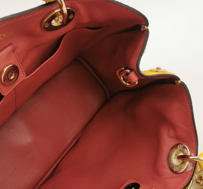 This elegant Dior Diorissimo VIP Bag in a striking yellow hue is a testament to luxurious craftsmanship. Crafted from quality leather, it features sophisticated gold hardware and a practical medium-sized structure. The bag's interior is lined with soft beige suede, adding a touch of subtle elegance, while the solid pattern exterior provides a timeless appeal. Ideal for those who admire vintage Dior bags, this satchel and top handle bag stands out among used designer handbags. Its chic design and vibrant color make it a standout addition to any fashion-forward collection.