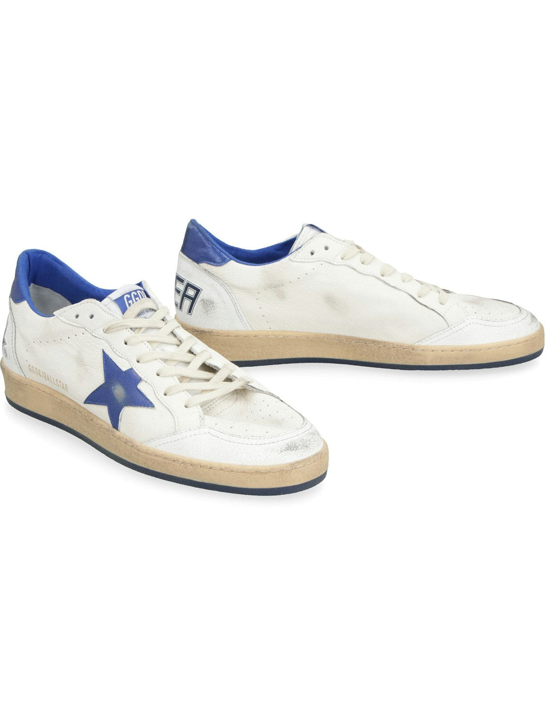 Step out in style with these Deluxe Brand sneakers. Made with white leather and featuring a metallic blue leather star patch, these sneakers are the perfect blend of vintage and modern. The round toe and metallic blue leather heel with white logo detailing add a unique touch to these must-have sneakers.