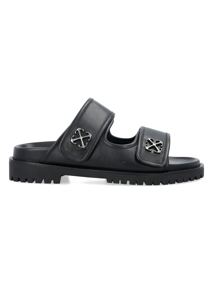 Step up your shoe game with the Leather Metal Arrow Sandal by Off-White. These sandals feature double velcro straps and a sleek silver-tone arrow detail, perfect for adding a touch of edge to any outfit. With a comfortable flat rubber sole and open toe design, these sandals are a must-have for both style and comfort.