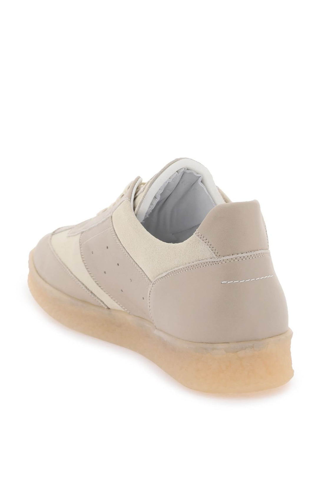 Step up your sneaker game with these MM6 Maison Margiela sneakers. Crafted from contrasting smooth leather and suede, these sneakers feature a lace-up closure, a tone-on-tone logo patch on the tongue, and iconic white stitching on the back. The leather interior comes with a removable insole for added comfort, while the rubber sole provides durability and traction. Whether you're dressing them up or down, these sneakers are the perfect blend of style and comfort.