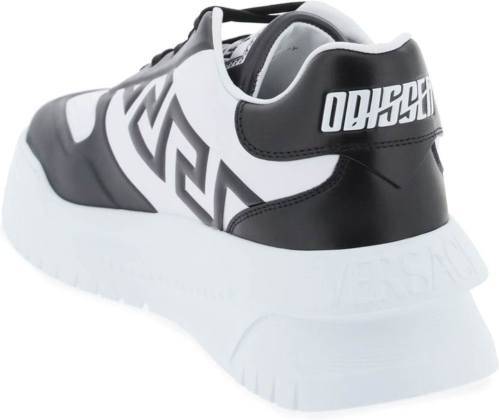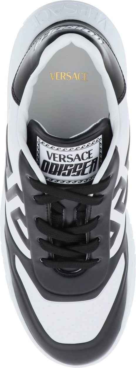 Step up your style game with these VERSACE ODISSEA LEATHER SNEAKERS, featuring the signature embossed Greca motif and a fabric logo patch on the tongue. These sneakers also boast a front lace-up closure, perforations on the toe, lettering print on the heel tab, and a rear embossed logo. With a fabric interior, removable leather insole, and rubber sole, these sneakers offer both comfort and style.