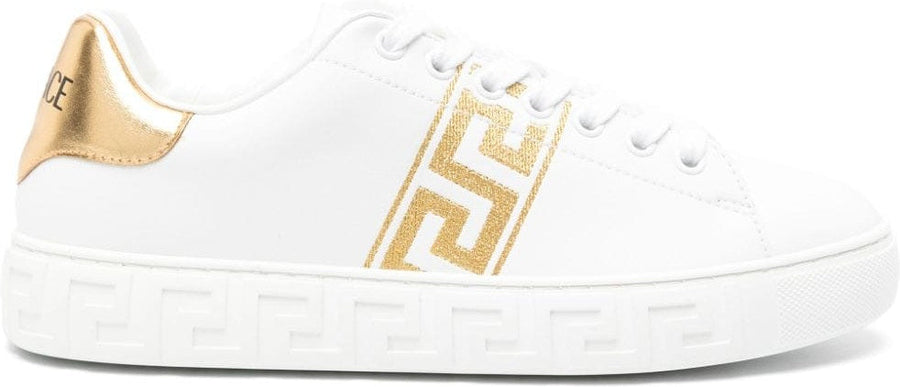 Step up your footwear game with these luxurious leather sneakers from Versace. The iconic Greca-embroidered detailing and exclusive embossed outsole make a bold statement that will turn heads. With a modern, sophisticated design and high-quality craftsmanship, these sneakers are a must-have for any fashion-forward individual.