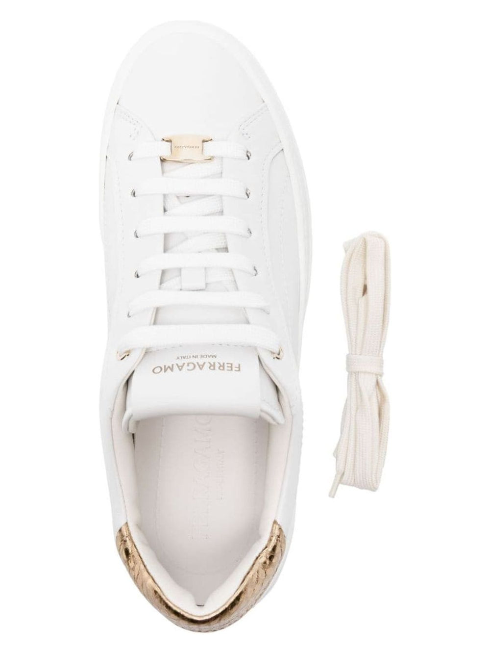 - White and gold-tone calf leather with a panelled design