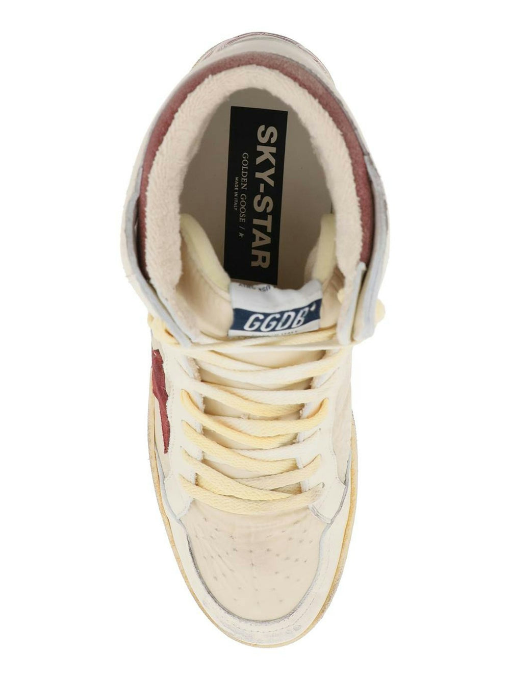 Step up your sneaker game with these SKY-STAR hi-top sneakers from Golden Goose. The used-effect smooth leather and padded nylon with contrasting suede side star and sneakers print on the back gives them a unique look that will turn heads wherever you go. Plus, with their perforated toe, fabric logo patch on tongue, and comfortable leather removable insole, you'll be both stylish and comfortable all day long.