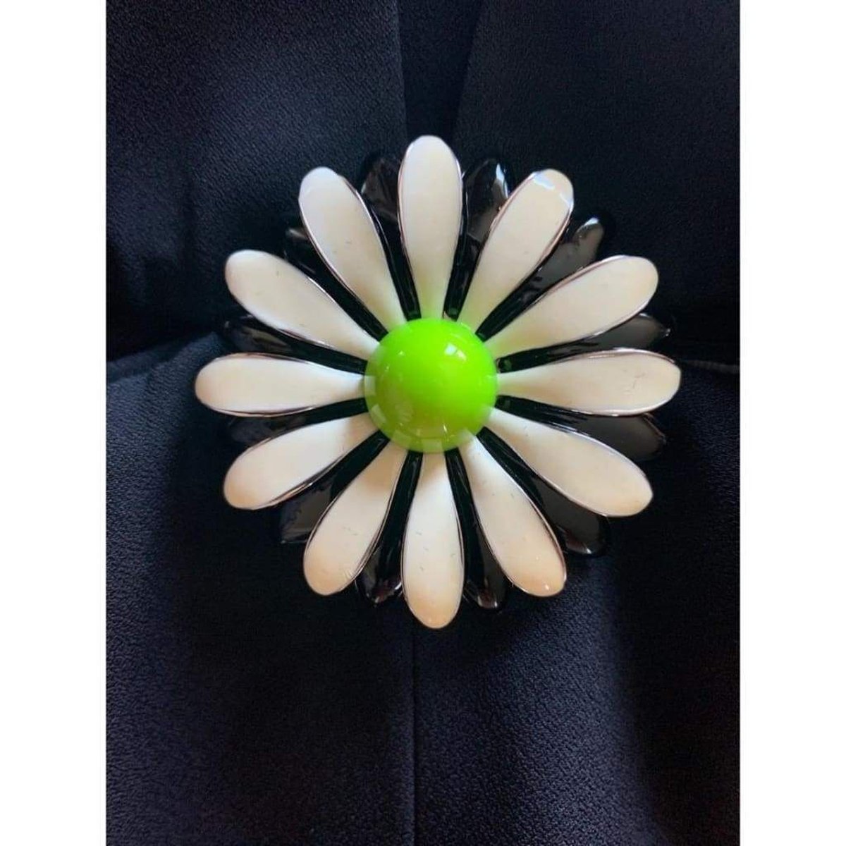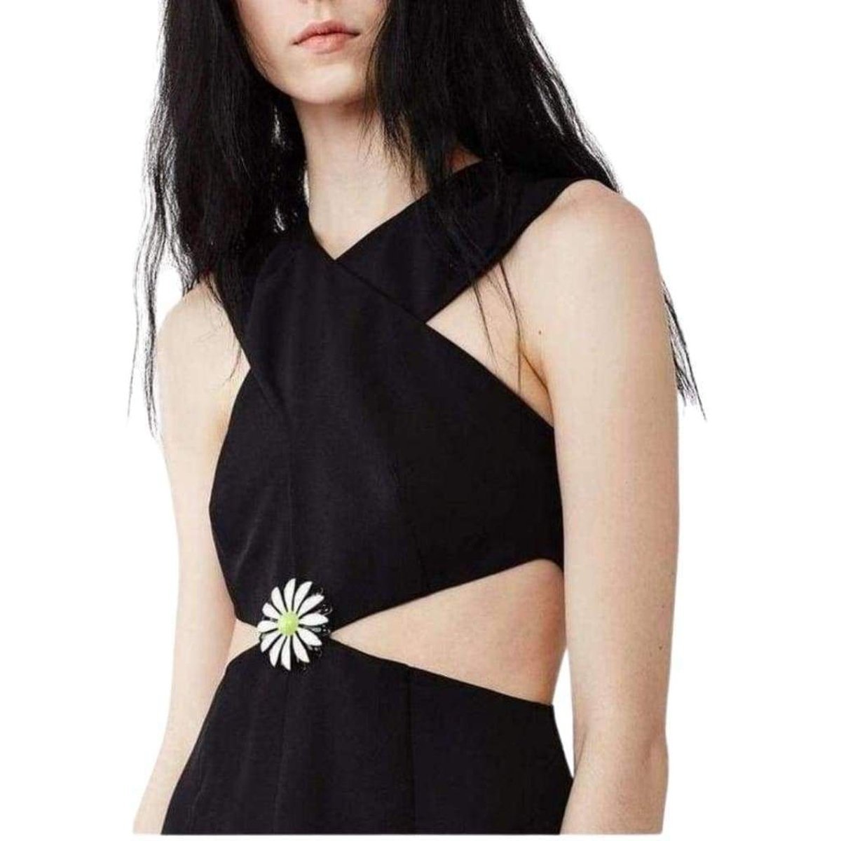 Featuring a delightful metal daisy at front and center, the rest of the dress criss-crosses and wraps around with flowy black viscose.