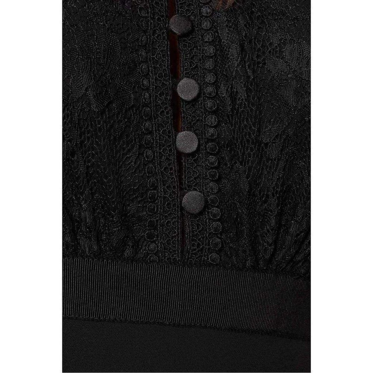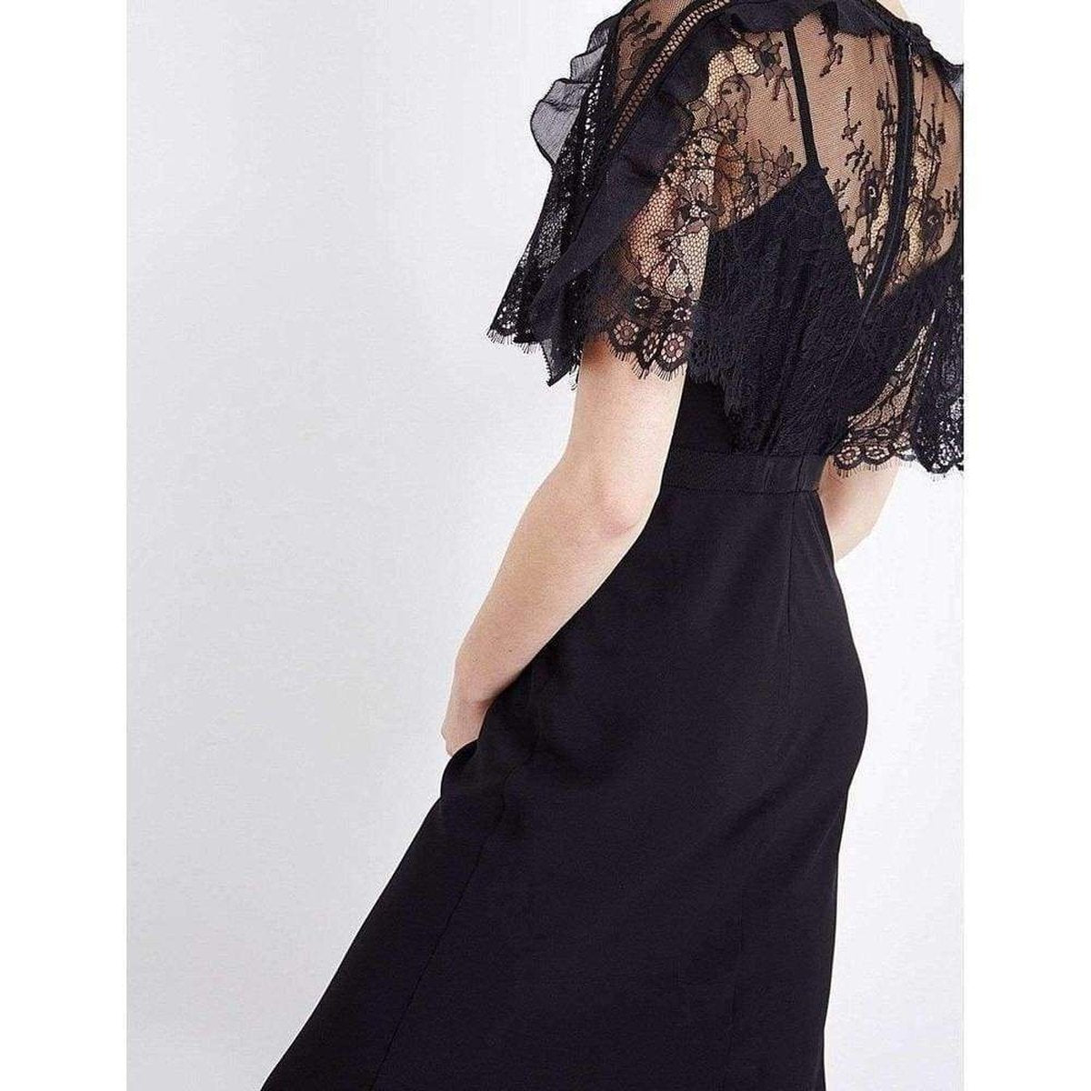 Perfect for party season, the nipped-in silhouette features a floral lace cape overlay trimmed with organza ruffles.
