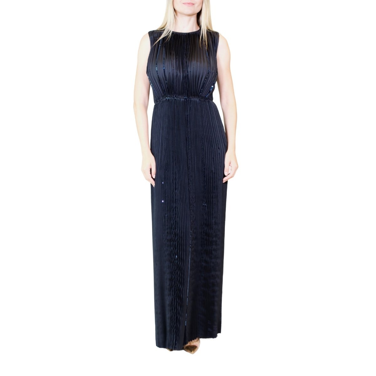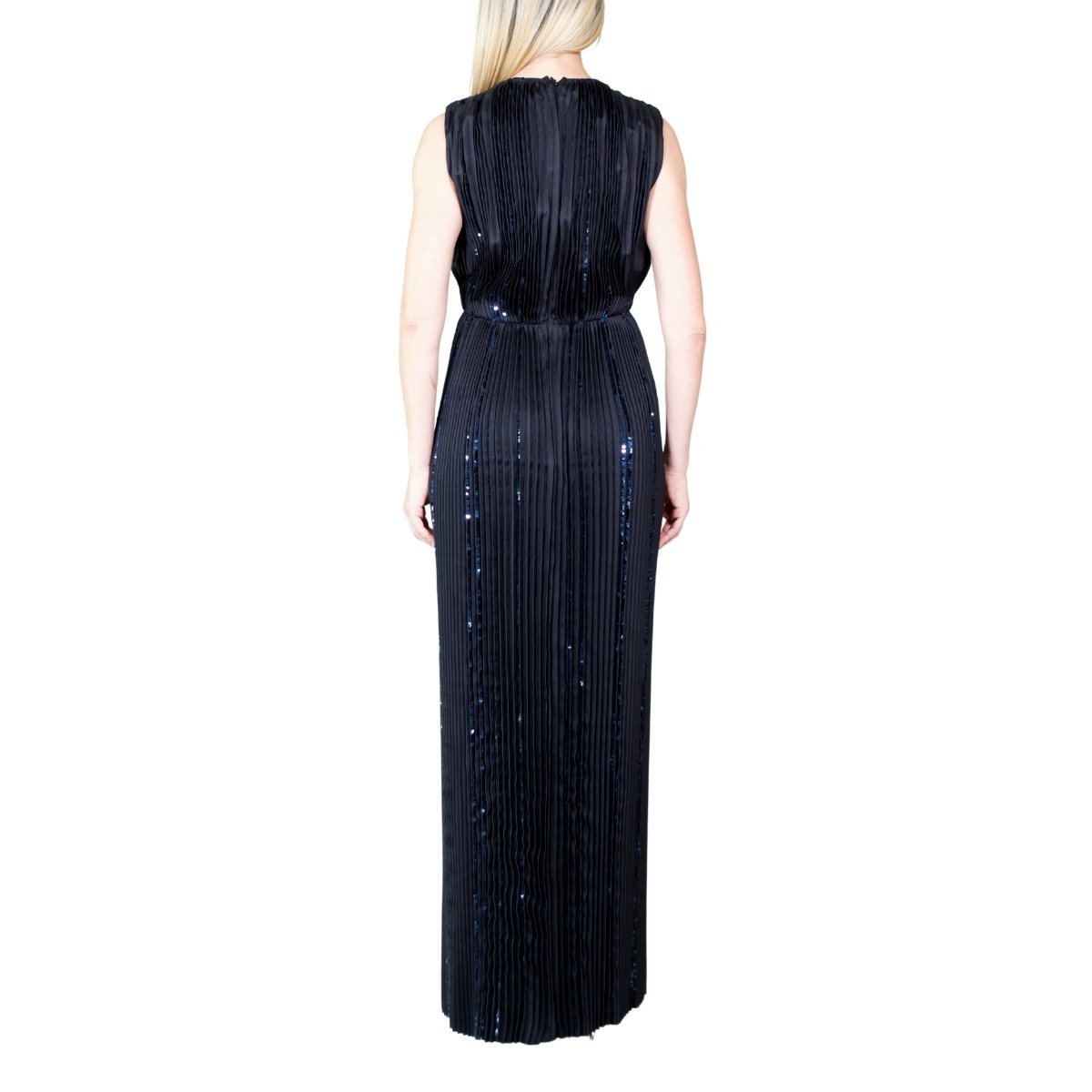 Black silk gown from Nina Ricci featuring sequins all over, pleats all over, round neck.